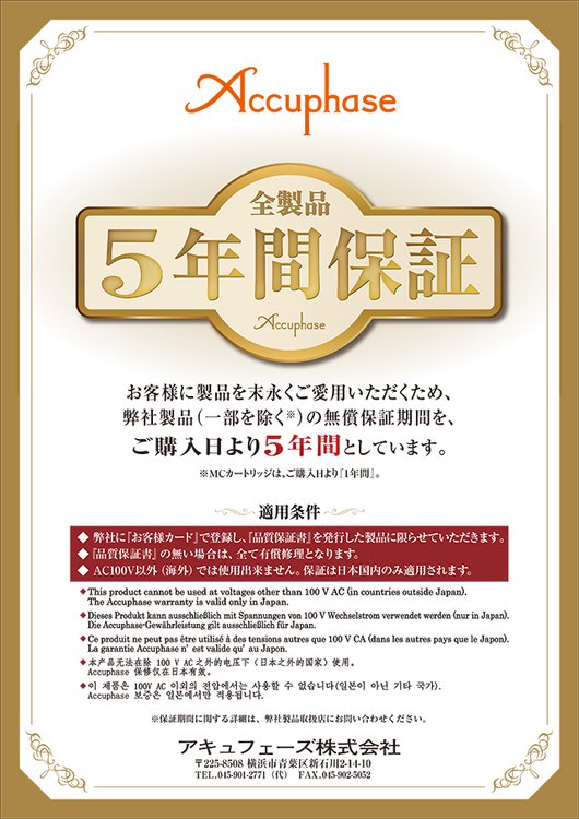 2023年6月1日(木)よりアキュフェーズ全製品の無償保証期間が「5年間」となりました。※MCカートリッジは対象外(保証期間1年)です。