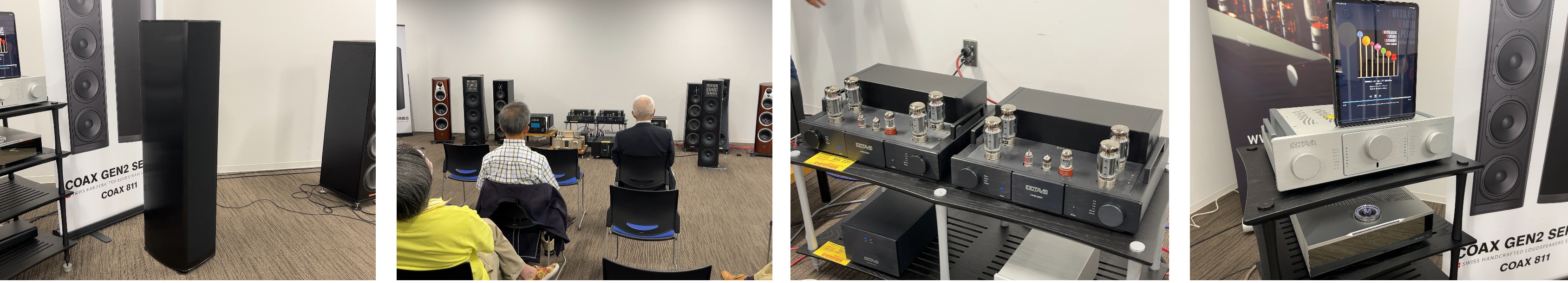 スイスPIEGA(ピエガ)の新シリーズ“COAX GEN2”のスピーカー「COAX 811/BK」のデモが行われました。こちらは新開発同軸リボンユニットを使用しており、非常に繊細で澄んだ音が魅力でした。その他の機器はドイツOCTAVE(オクターブ)のモノラルパワーアンプ「MRE220」、強化電源「Super Black Box(ブラックとシルバーカラーを展示)」が使用されました。