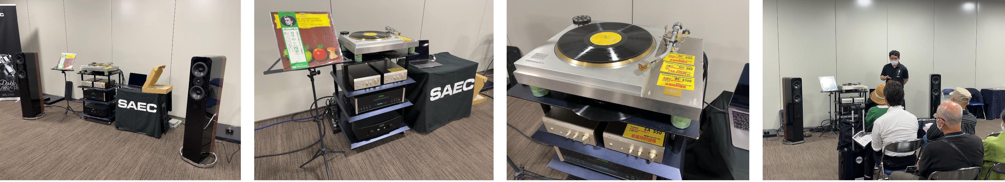 こちらでは人気国内ブランドSAECのオーディオアクセサリー(ケーブル、スタビライザー、ターンテーブルマット、グラウンドアースなど)を使用した試聴会を実施。試聴や比較などでオーディオアクセサリーの重要性と、同ブランド製品の魅力を体感することができました。また、お客様のリクエストに応じた比較試聴も行なっておりました。