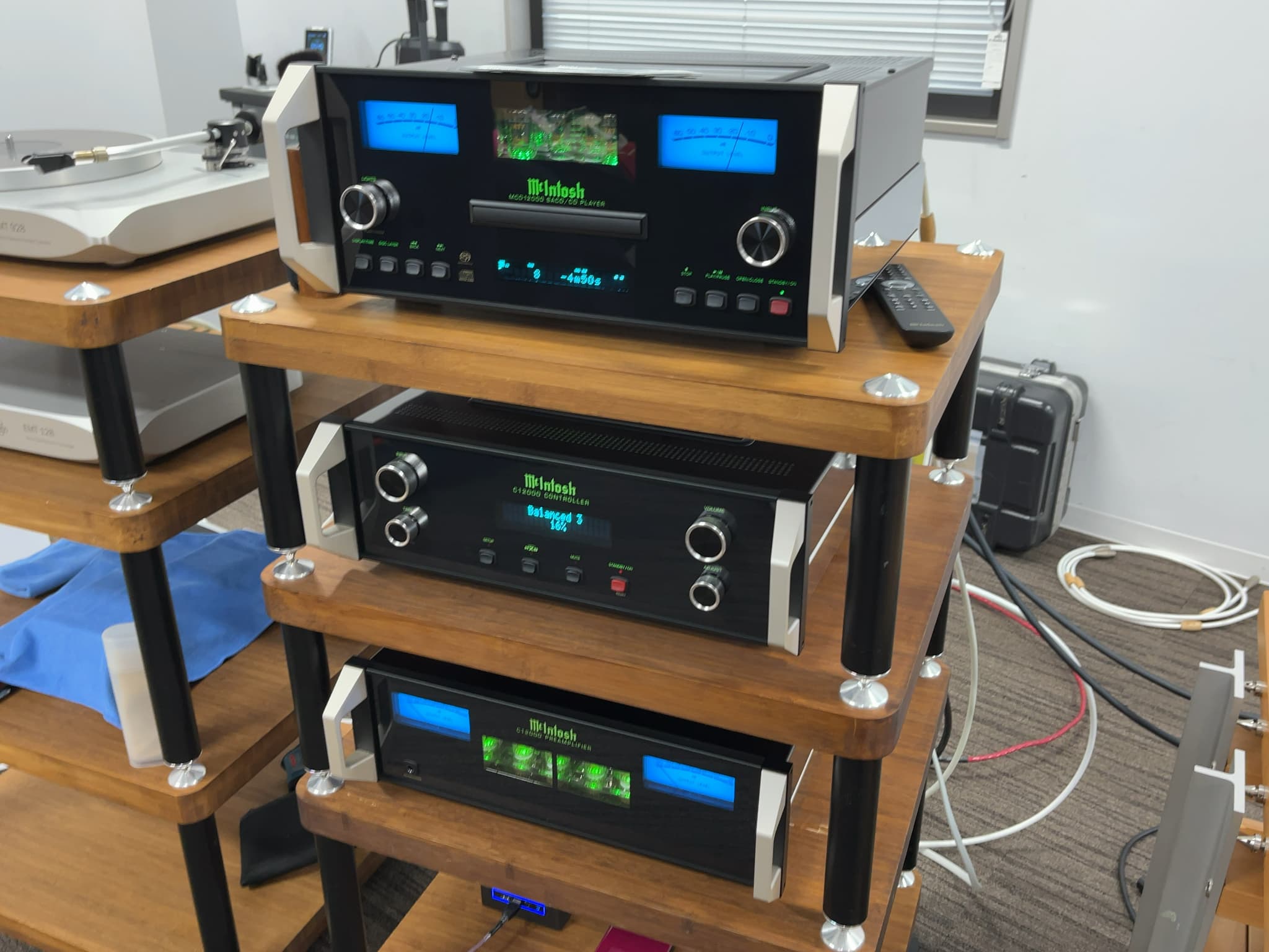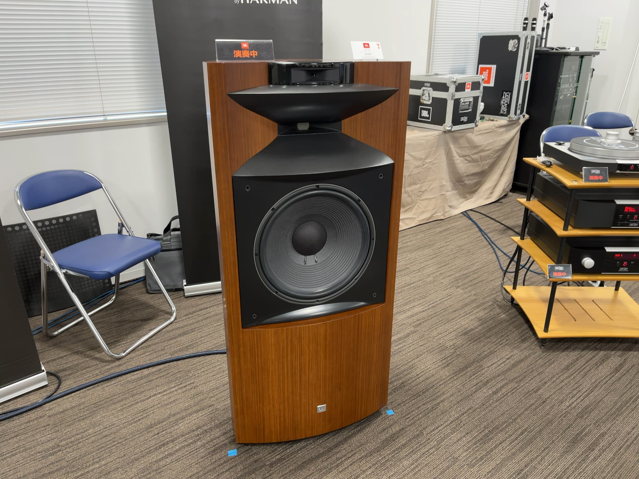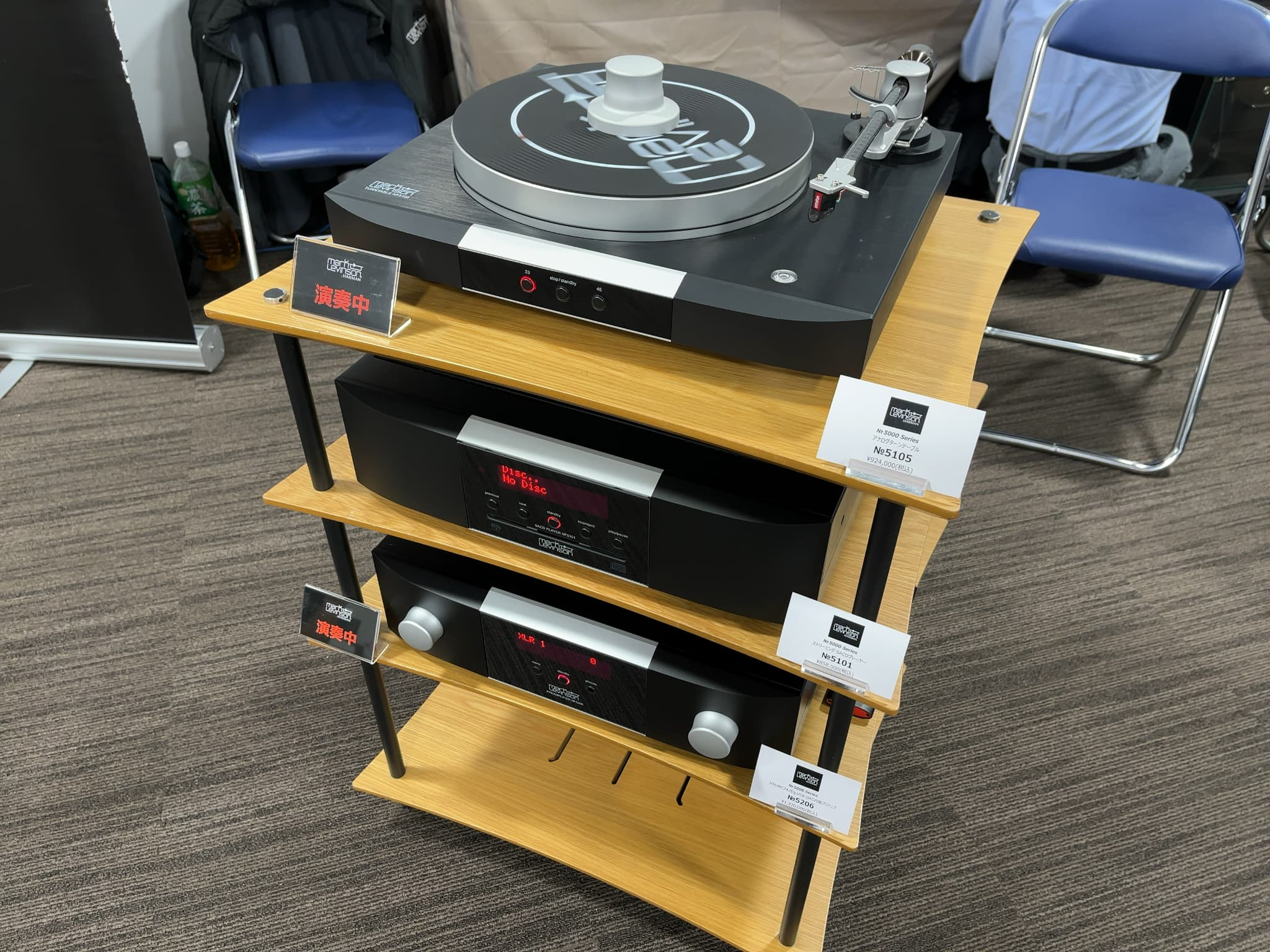38㎝ウーハーを搭載したJBL(ジェービーエル)のフロア型スピーカー『PROJECT K2 S9900』を主役に、レコード・SACDの試聴を実施。システムは全てマークレビンソンの『No5000シリーズ』(モノラルパワーアンプ『No5302』、アナログプレーヤー『No5105』、プリアンプ『No5206』、SACDプレーヤー『No5206』)で統一されておりました!