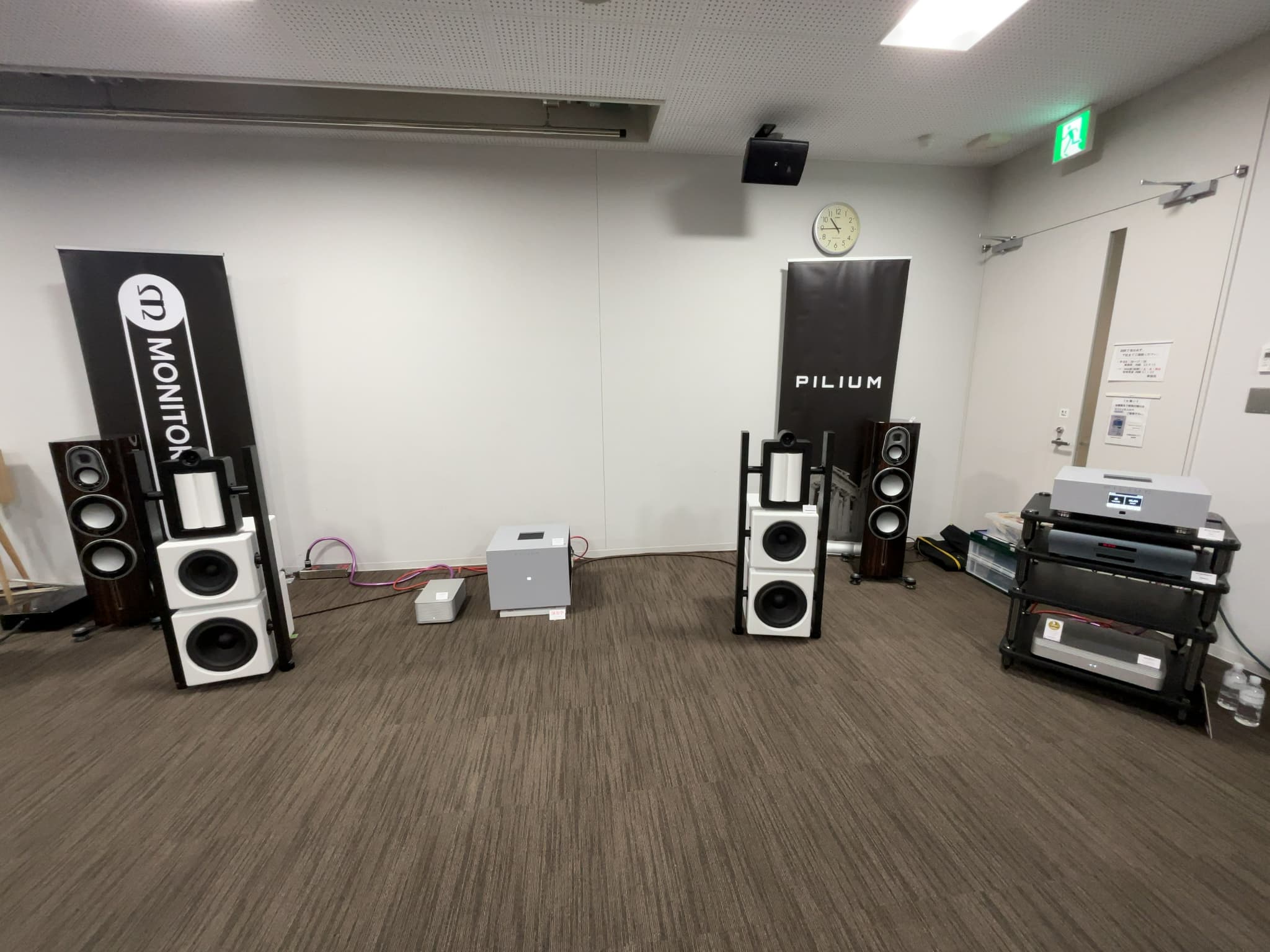 こちらのメインはPILIUM(ピリウム)!発売前の新製品プリアンプ『Ares』と、ステレオパワーアンプ『Achilles』を展示しておりました!今回聴けた方は本当にラッキーだと思います!(笑)。その他、スピーカーは奇抜なデザインが目を引くAudio Nec(オーディオネック)の『EV02-PW』、Playback Designs(プレイバックデザインズ)のSACDプレーヤー『DREAM SERIESX』、IsoTek(アイソテック)のパワーコンディショナー『V5 AQUARIUS』『V5 TITAN』がございました。