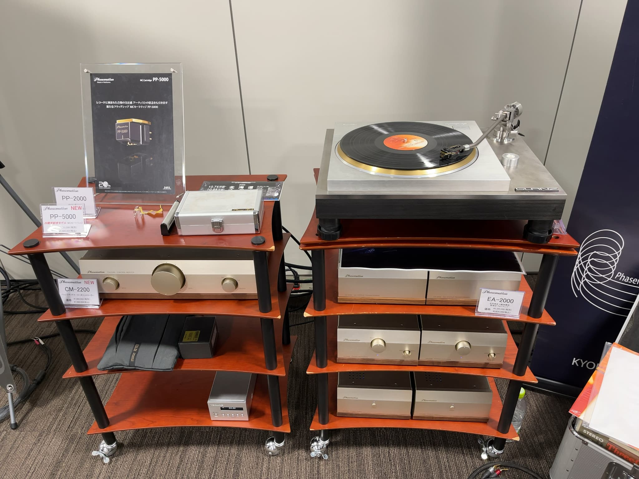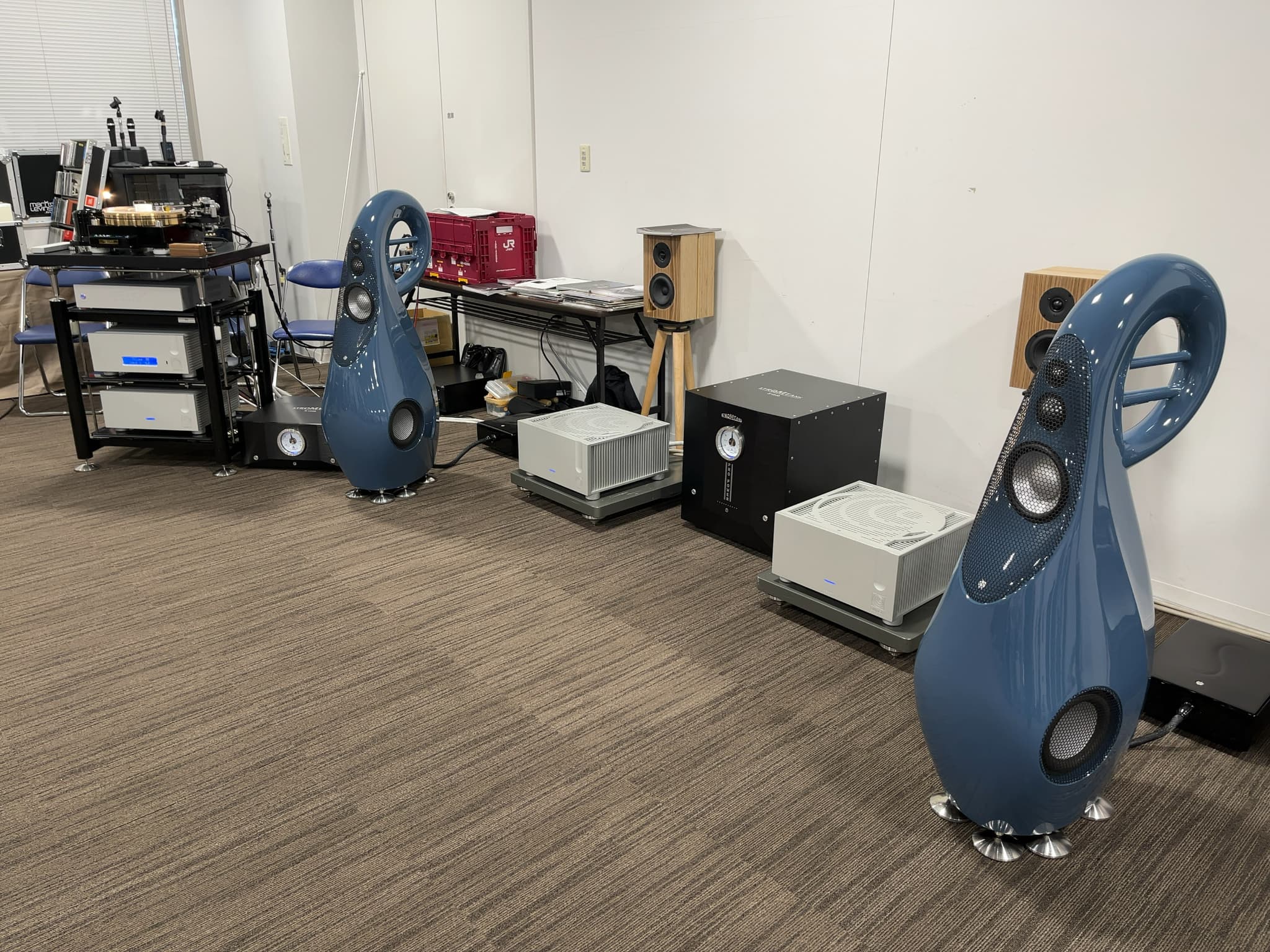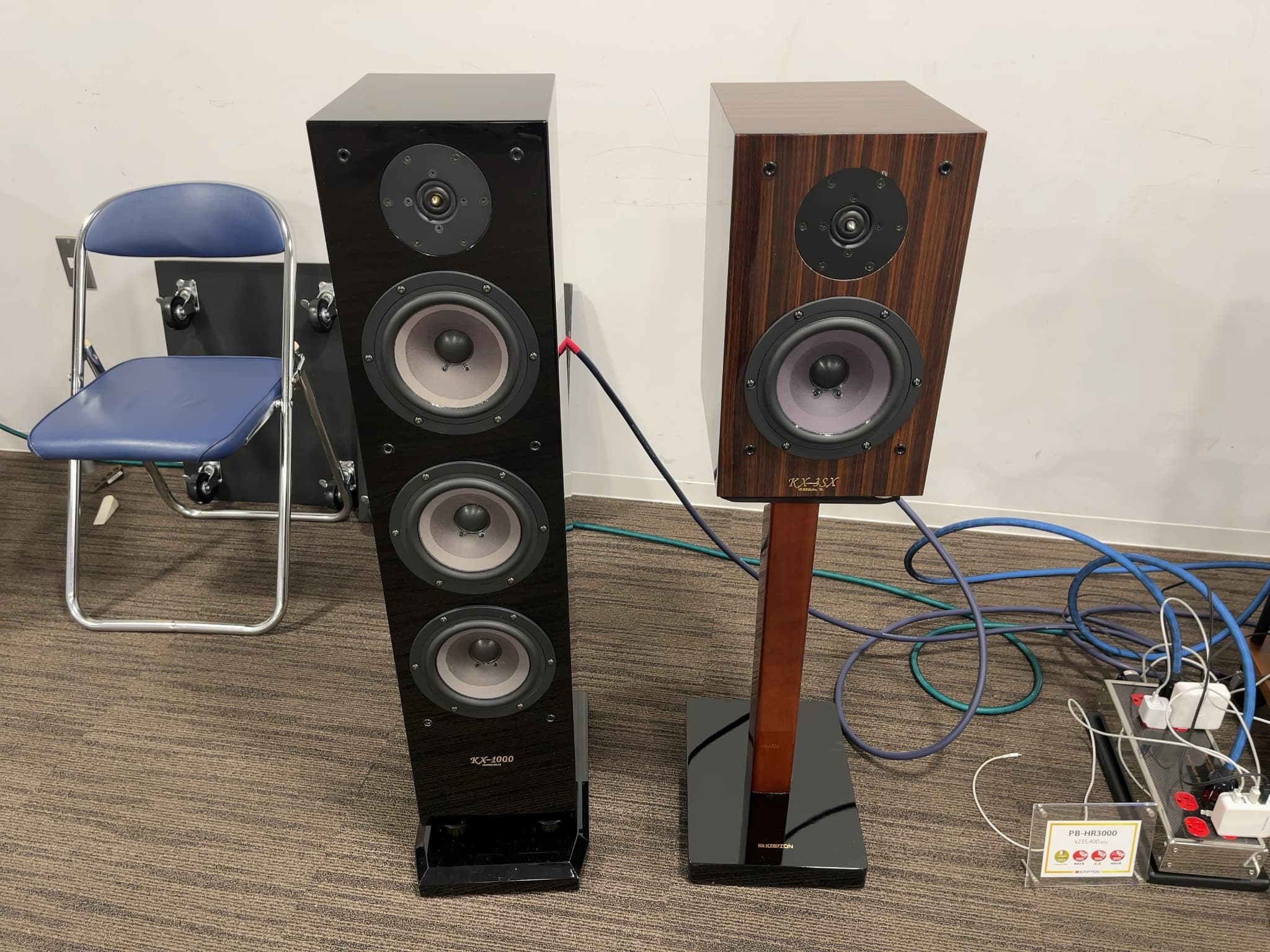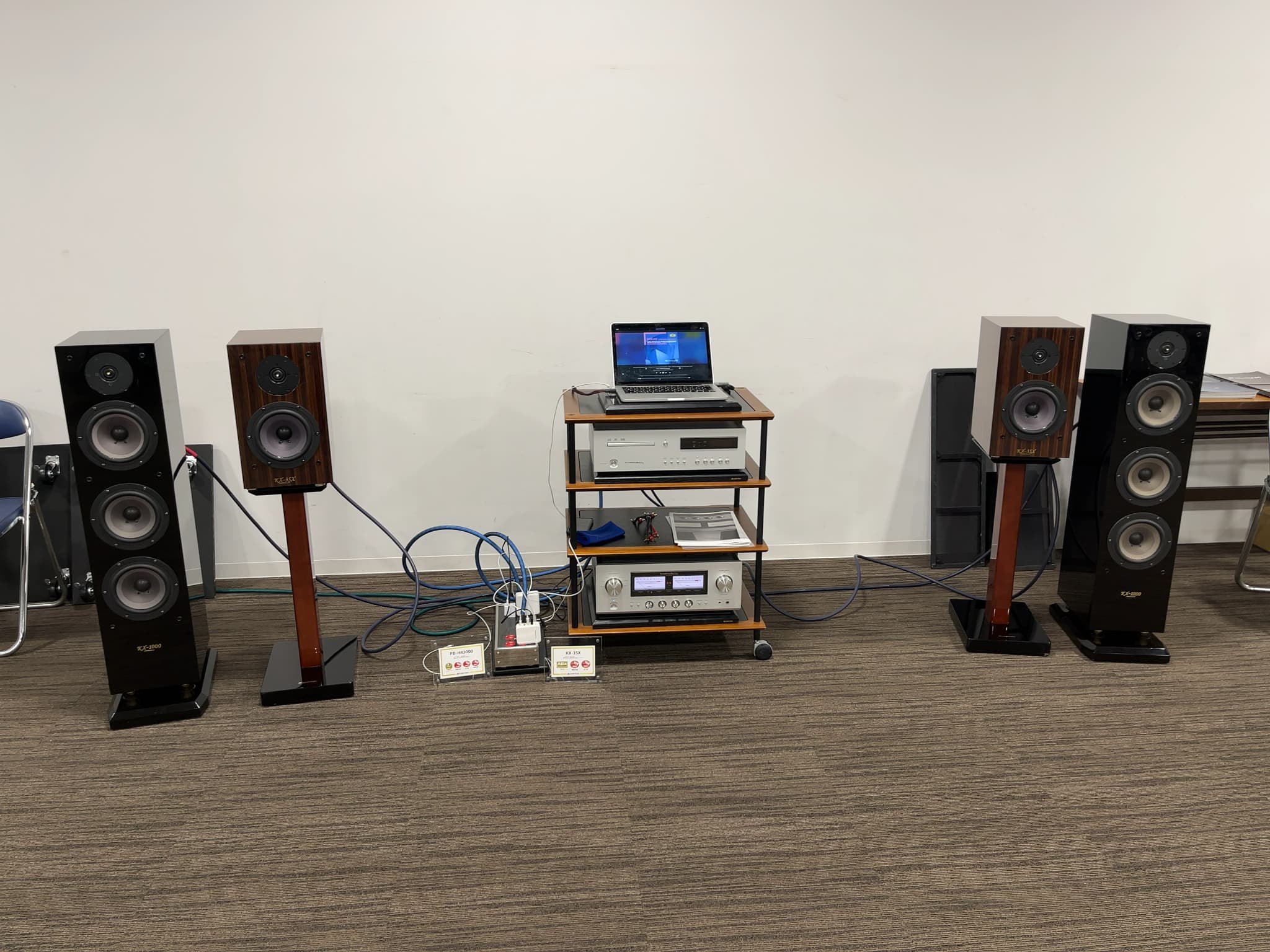 こちらはトールボーイ型スピーカー『KX-1000P』と、ブックシェルフ型スピーカー『KX-3SX』を使用し、モデルの違いや、バイワイヤリング/シングルワイヤリングの違い、電源BOXの有り無しなど、様々な音の比較を行いました。後者の2つは気になっている方も多いのでは!?電源BOXはフラッグシップモデル『PB-HR3000』を使用しておりました。