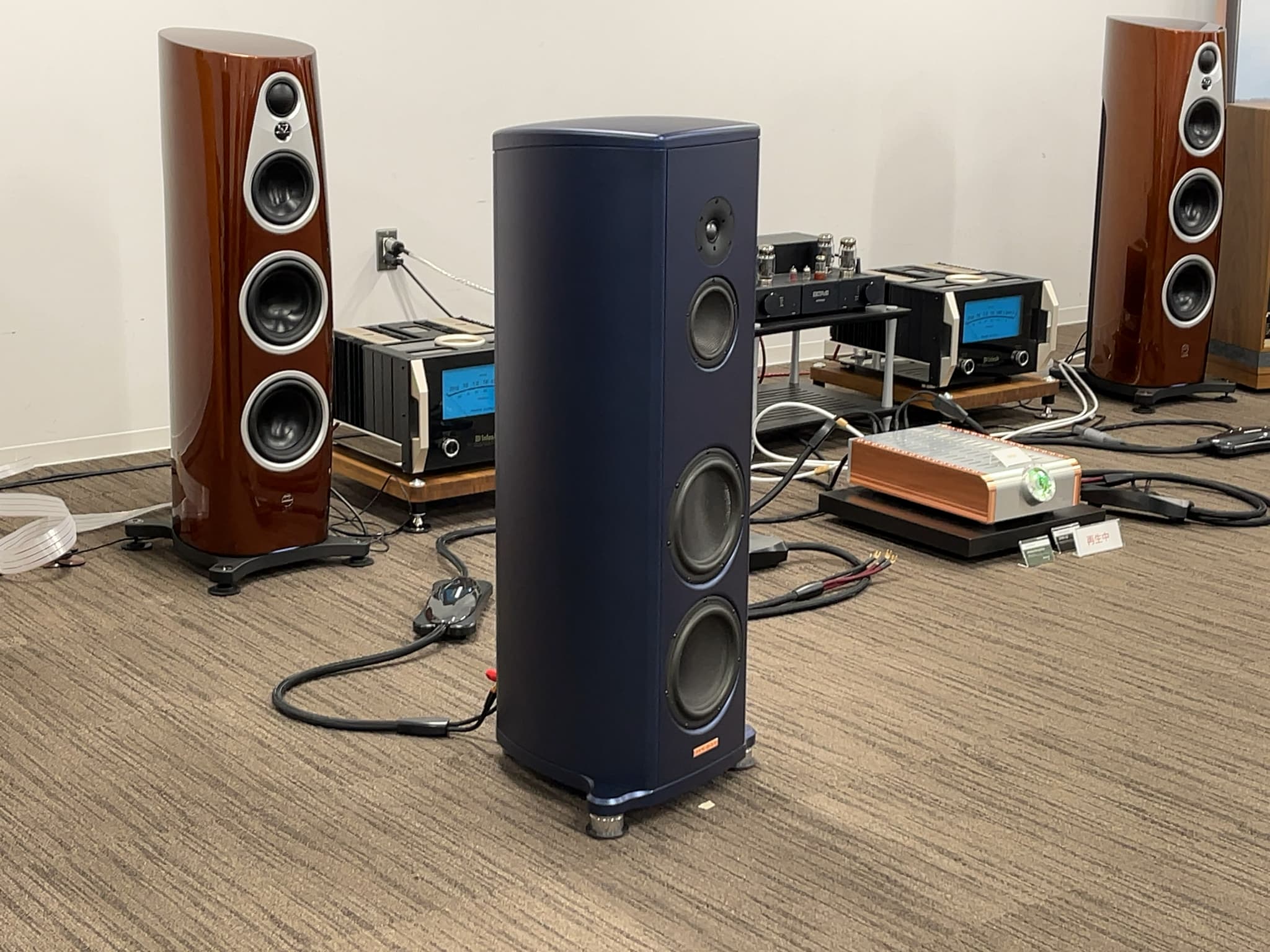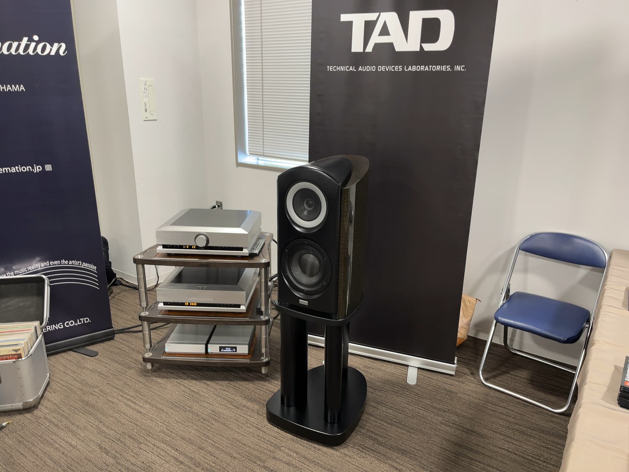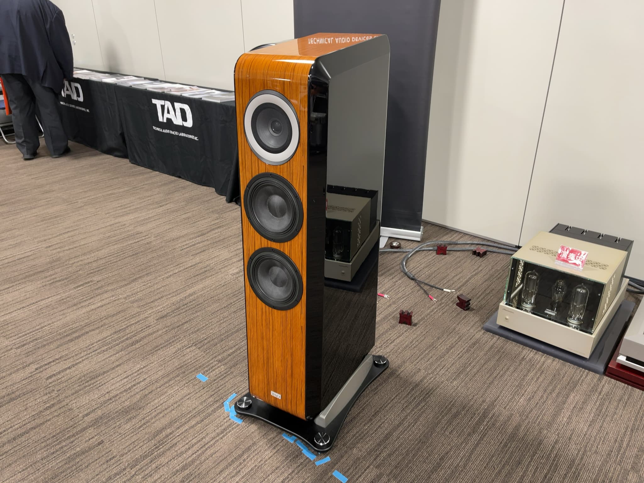 こちらのメインは、国内での大型イベントでは初出展の新製品フロア型スピーカー『TAD-GE1』!11月下旬発売予定ですが、今回展示が実現しました!その他、理想的な点音源再生を実現する「CSTドライバー」を採用したブックシェルフ型スピーカー『TAD-CR1TX』や、新製品のプリアンプ『TAD-C1000』、同シリーズのSACDプレーヤー『TAD-D1000TX』がございました!