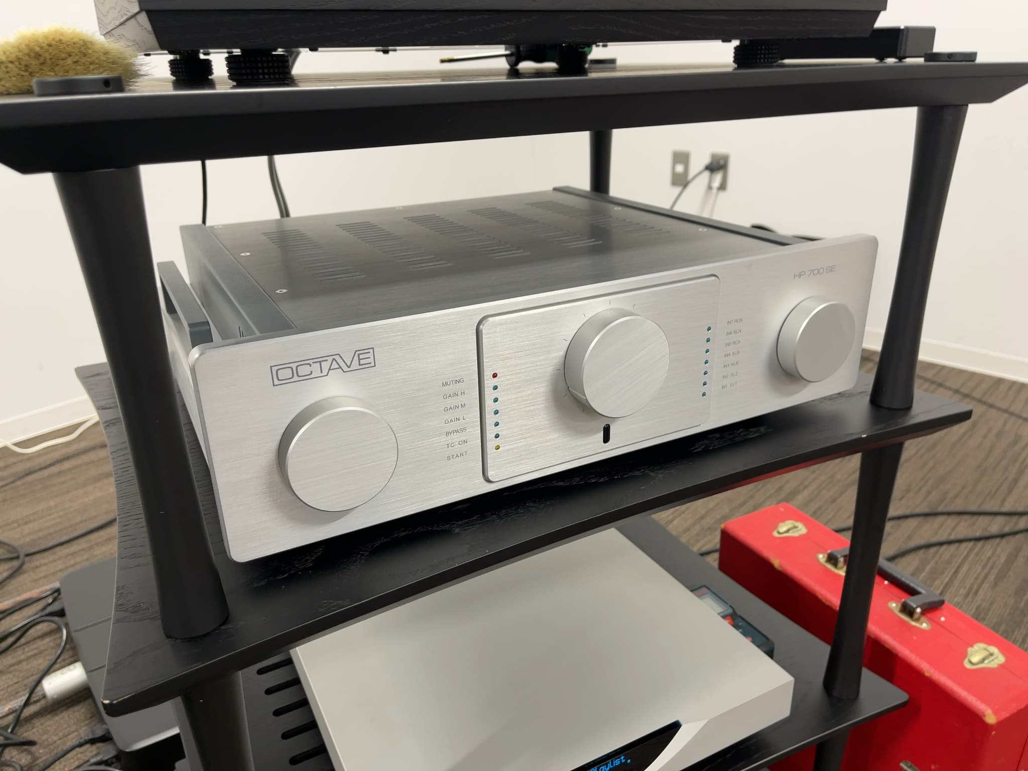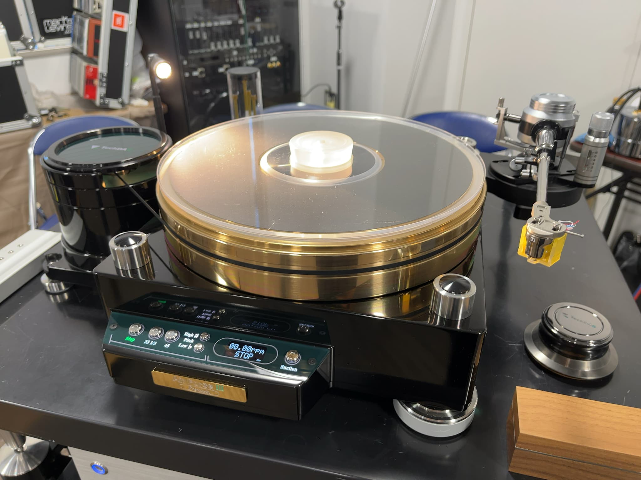 TechDAS(テクダス)のアナログプレーヤー『Air Force III Premium S』(※『Air Force III Premium』にサスペンションフットを搭載したモデル)をメインとして、Ypsilon(イプシロン)のプリアンプ『PST-100MK2SE』、モノラルパワーアンプ『Aerius2MonoSE』等のシステムの他にVividAudio(ビビッドオーディオ)のフロア型スピーカー『G3GiyaS2EX』や、STROMTANK(ストロムタンク)のバッテリークリーン電源『S-4000Pro』『S-1000』といった、ステラが取り扱う様々なブランド製品でレコードの試聴を行いました。