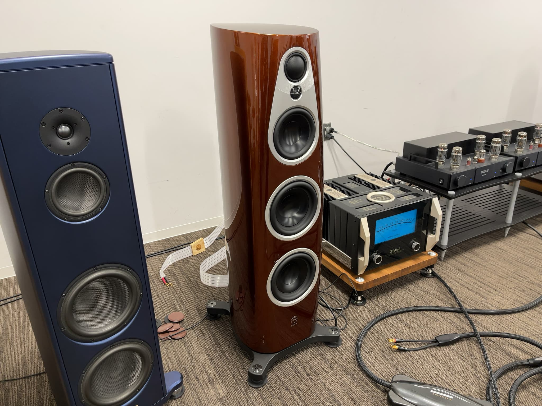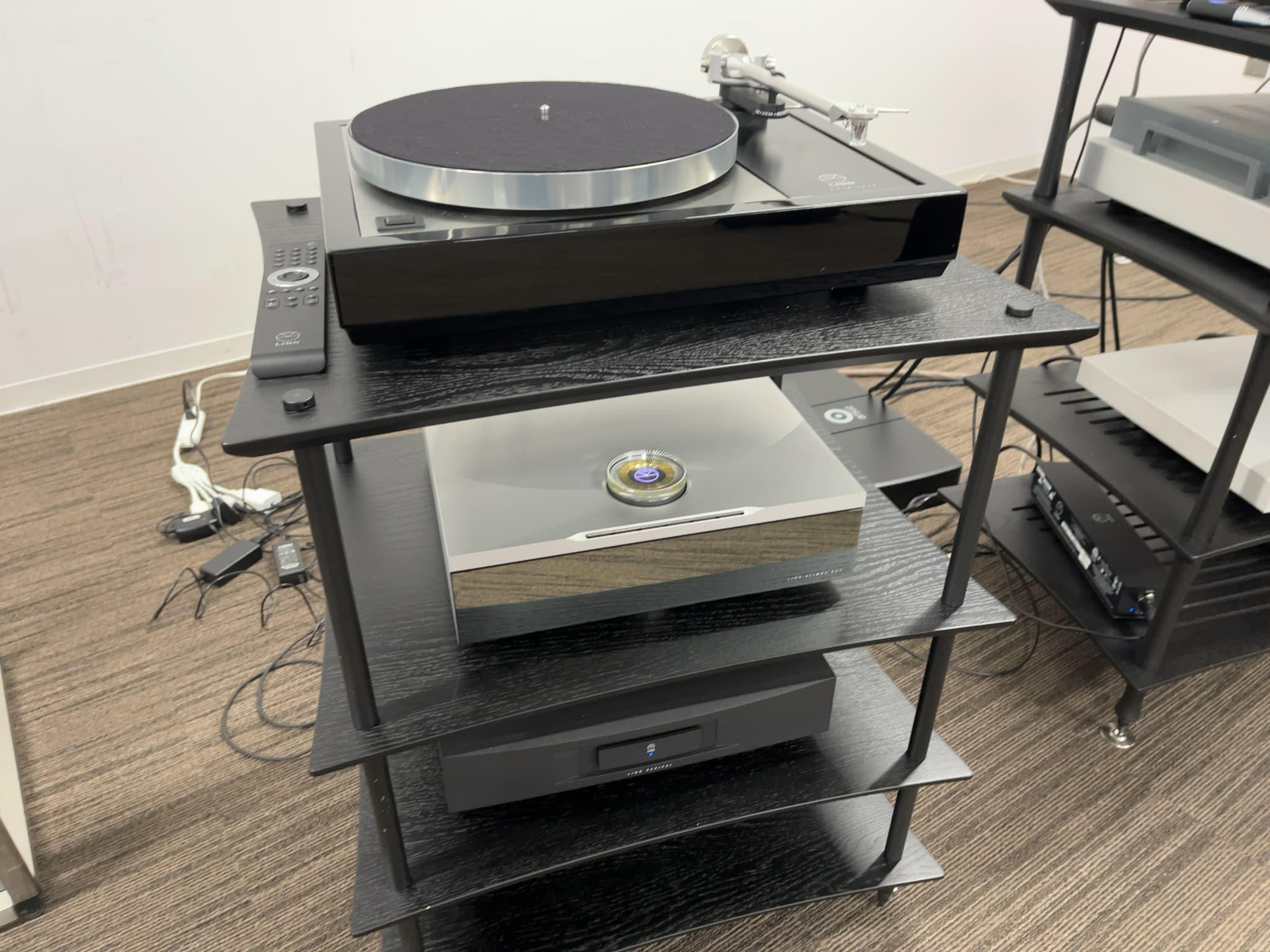 こちらではLINN(リン)ブランド創立50周年を記念して製作された新製品フロア型スピーカー『360 EXAKT』の試聴をメインとしたデモが行われました。内容はネットワークプレーヤー『KLIMAX System Hub/1』によるファイル音源の再生と、アナログプレーヤー『KLIMAX LP12 SE』によるレコードの再生でした。