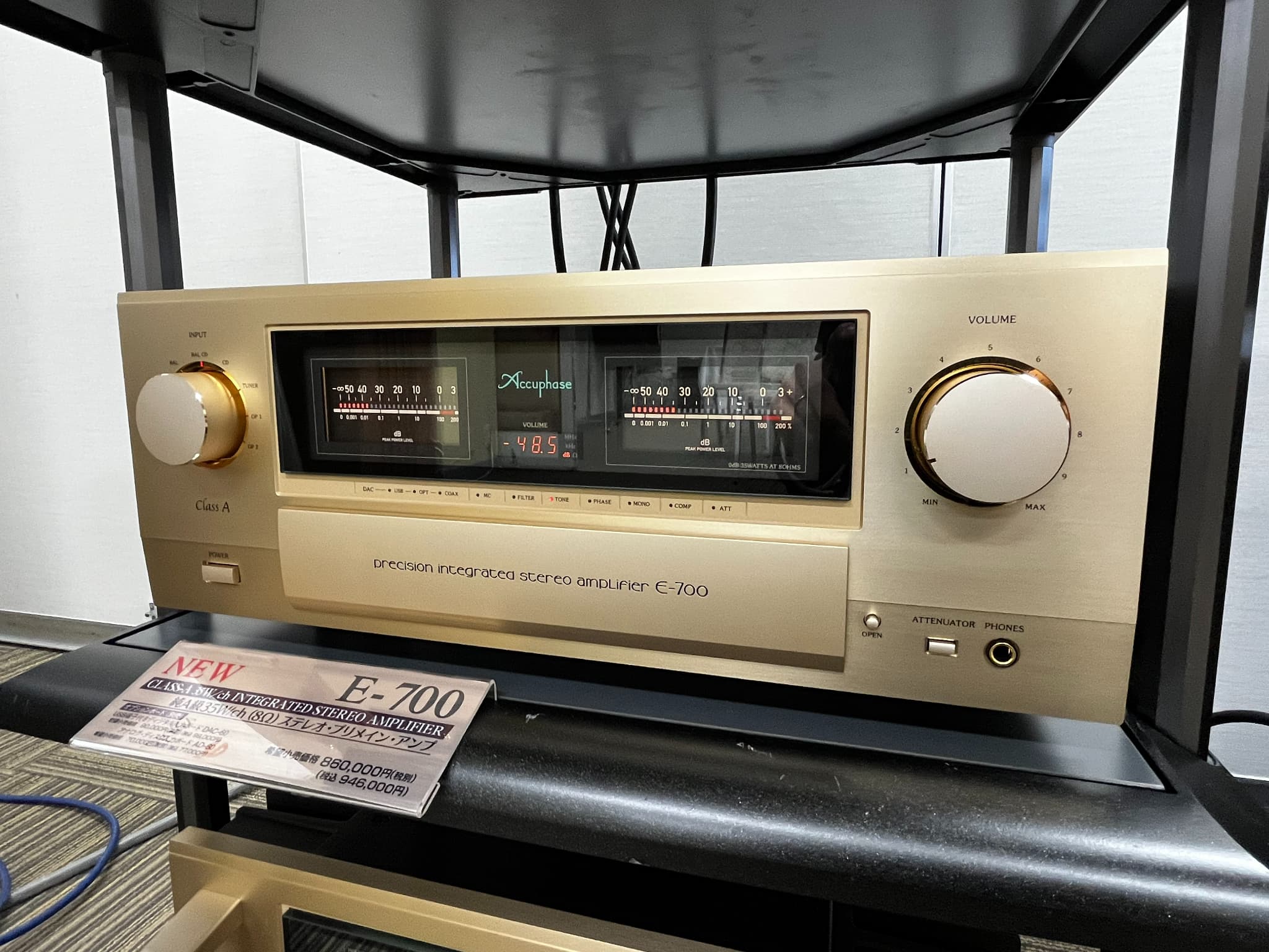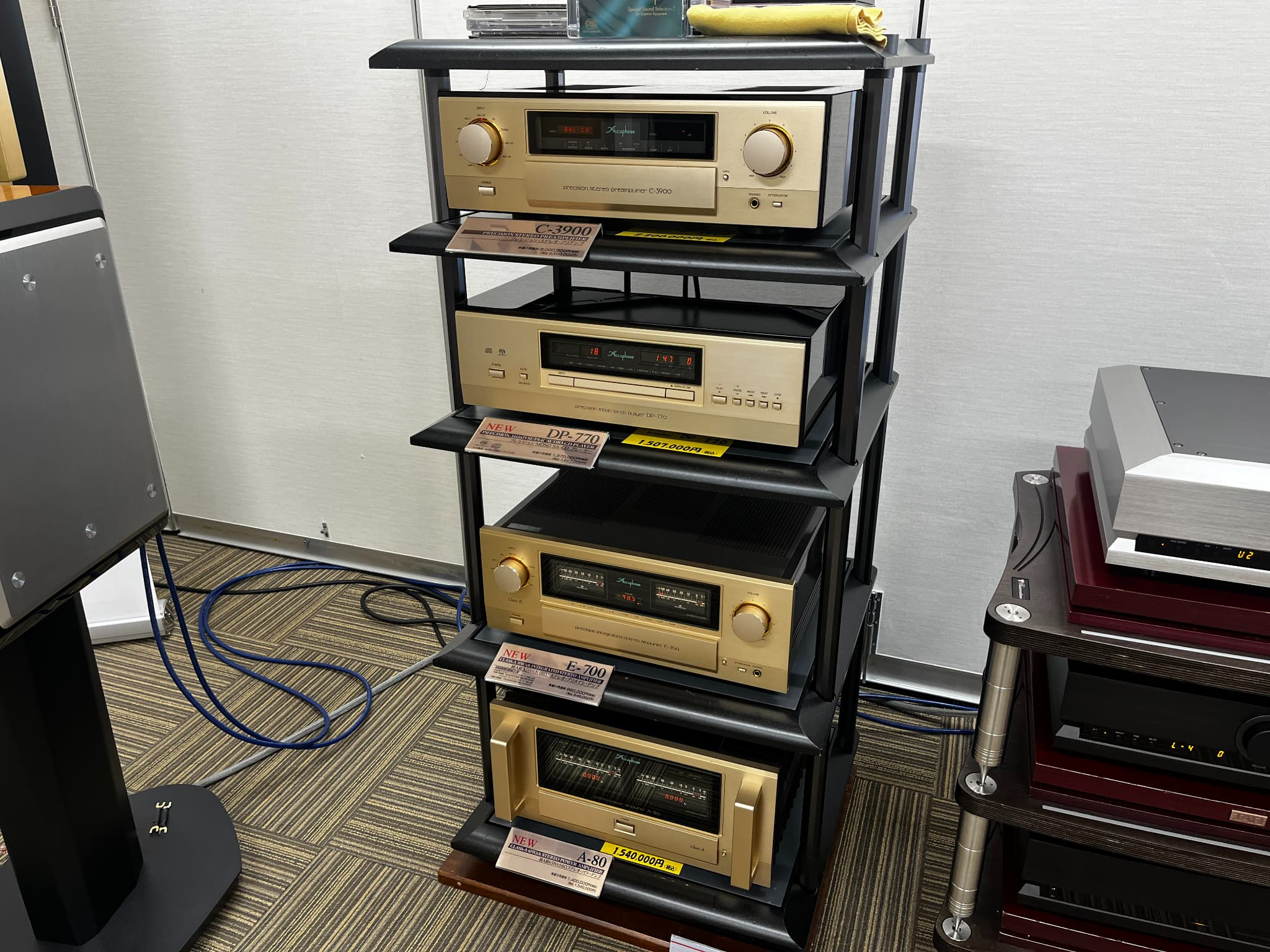 SACDプレーヤ-『DP-770』、プリメインアンプ『E-700』、パワーアンプ『A-80』の新製品3機種を含めたシステムを展示。試聴会では「プリメイン」と「プリ&パワーアンプ」といった2つの組み合わせで音の比較などが行われました。