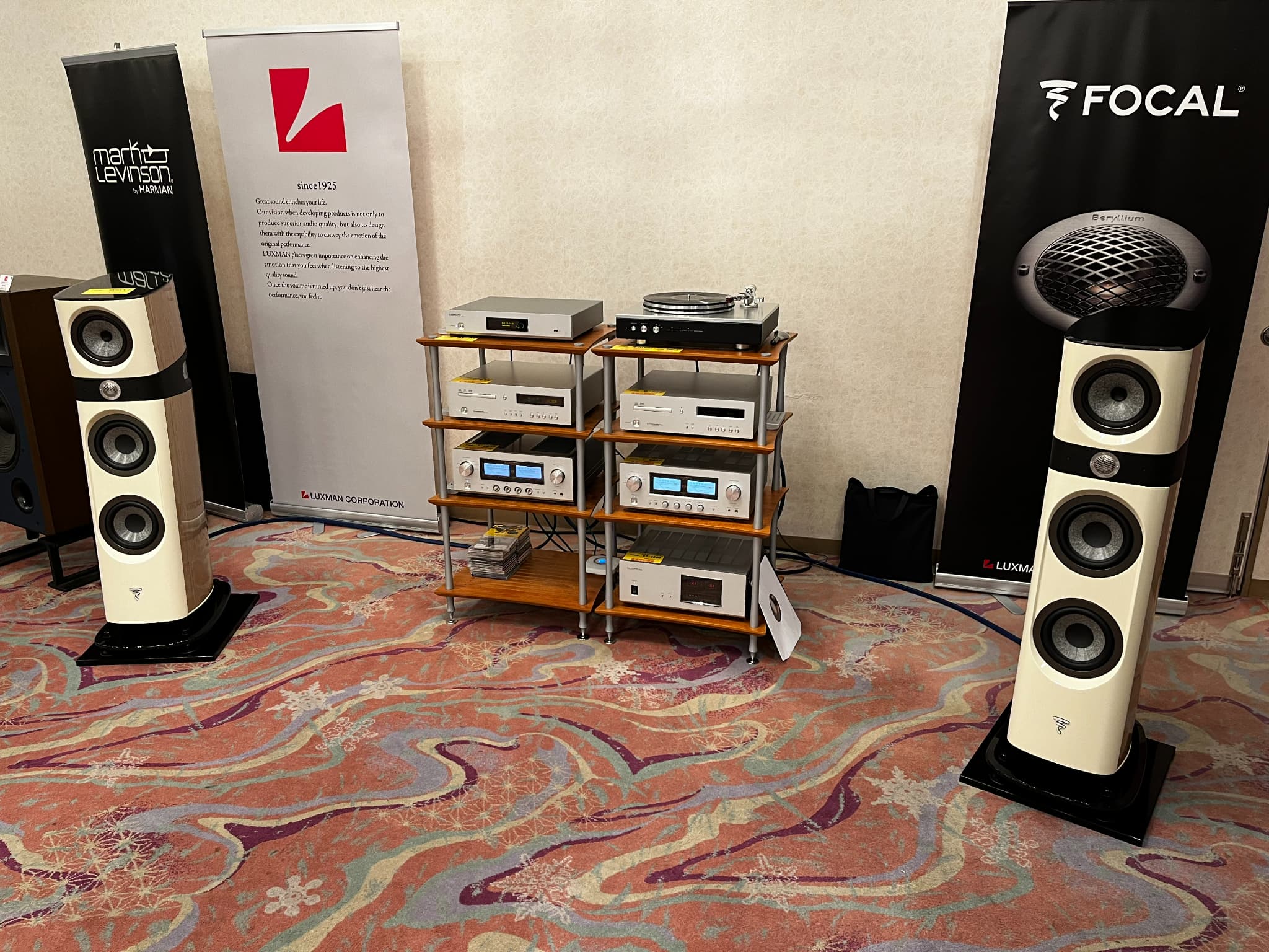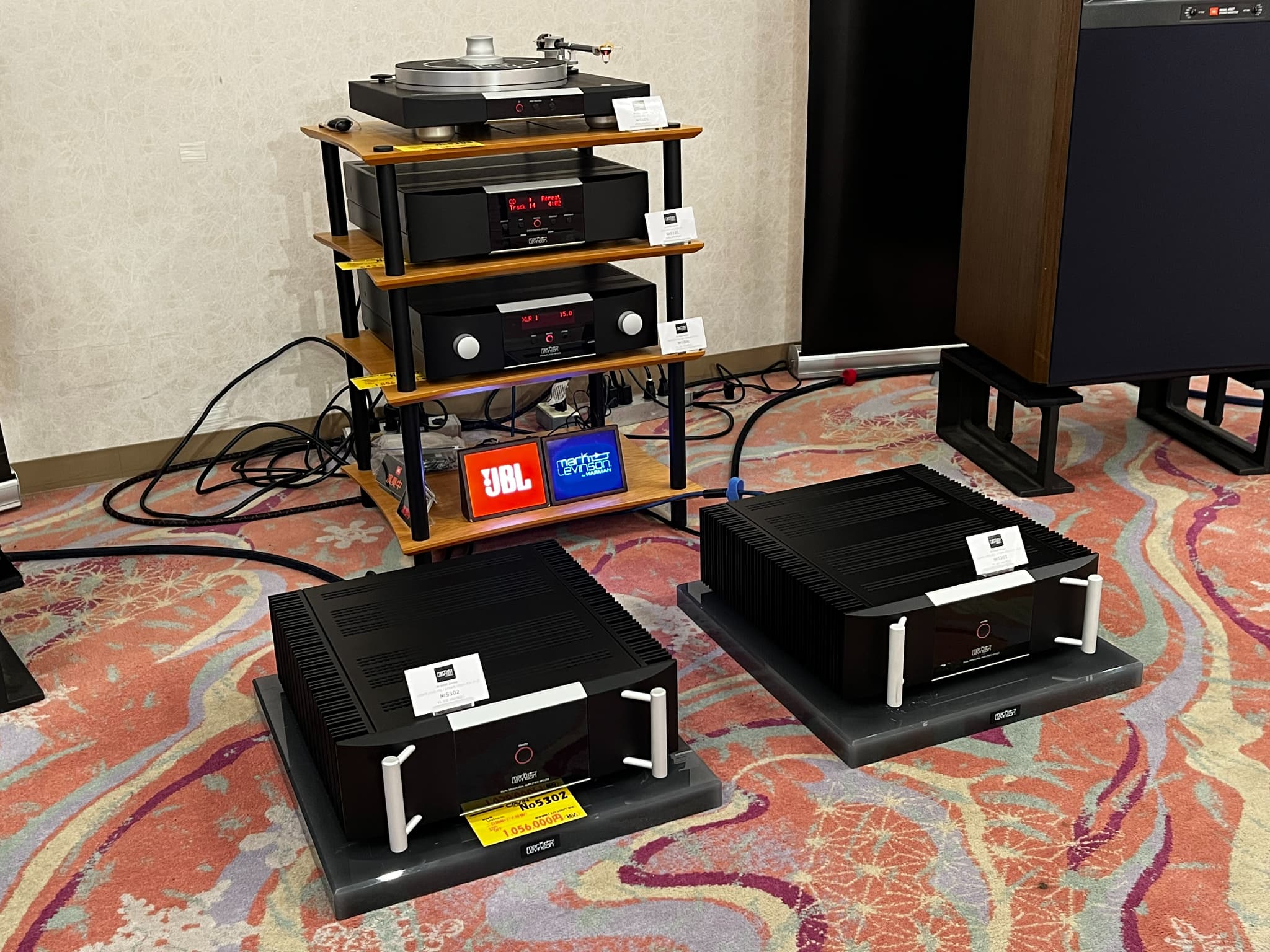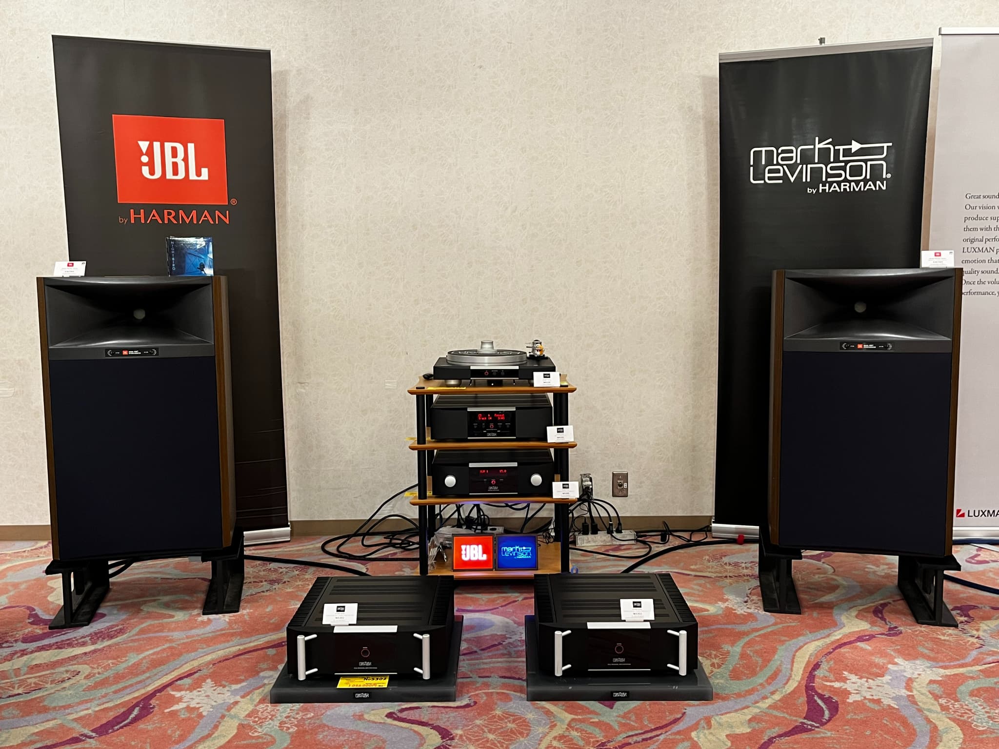 JBL(ジェービーエル)&Mark Levinson(マークレビンソン)のシステムを展示。スピーカーはJBLの38cmウーハーを搭載した『4367WX』。アンプやプレーヤーはMark Levinsonは全て『5000番シリーズ』という豪華な構成。試聴会では38cmウーハーの迫力あるサウンドが楽しめました。