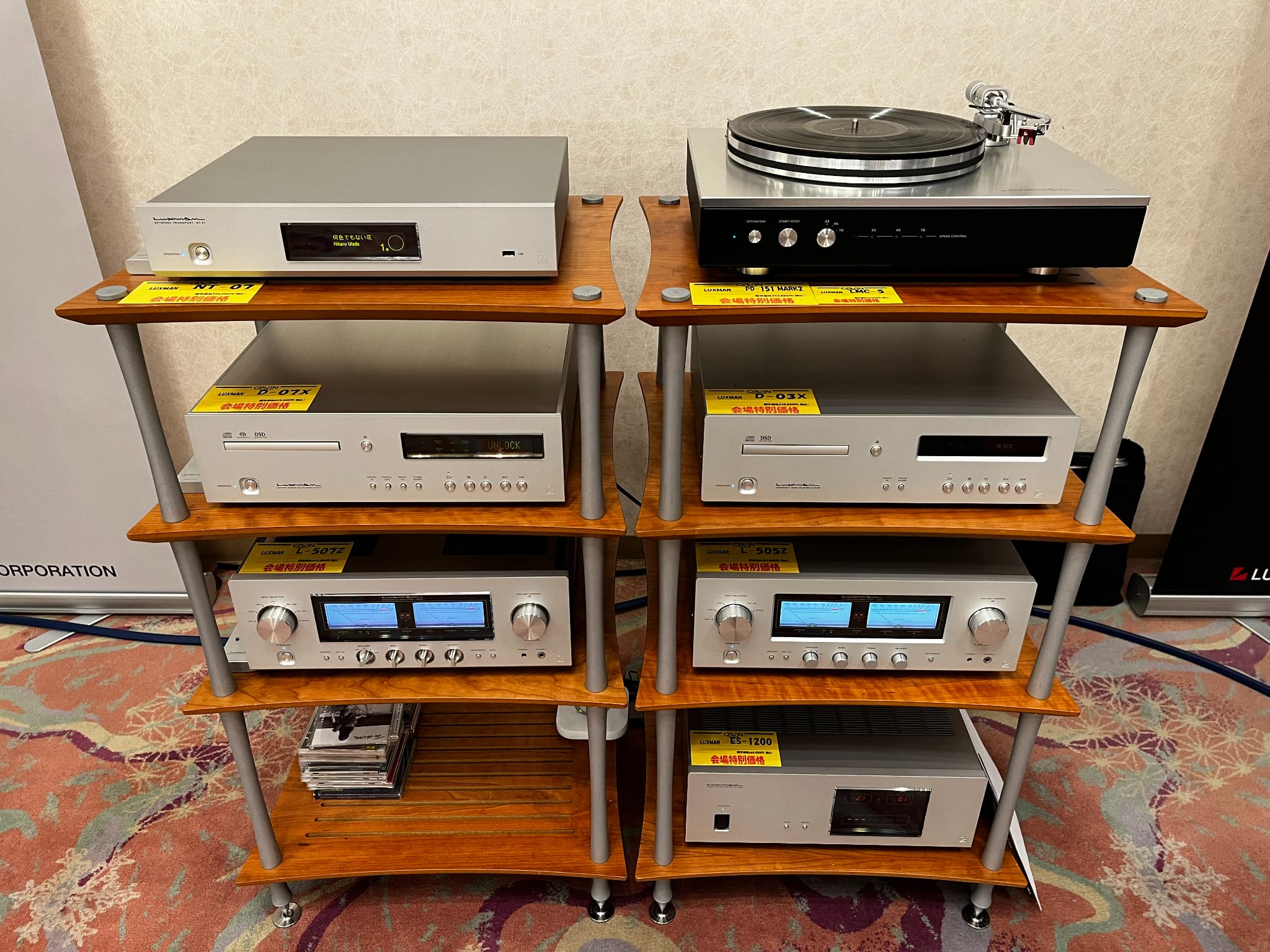 試聴会では同社初のネットワークトランスポート『NT-07』と、ベルトドライブ式アナログプレーヤー『PD-151 MARK II』を使ったレコード&音楽データの再生が行われました。システムはAB級プリメインアンプ2機種、CDプレーヤ-2機種(片方はSACD対応)といった、モデルの比較ができるものとなっておりました。メインスピーカーはフランスのFOCAL『Sopra No2』を展示。