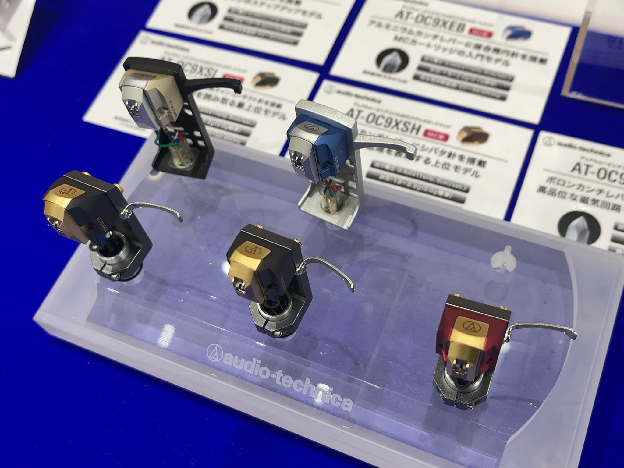 同社が取り扱うカートリッジを多数展示。その他、高級オーディオ用ケーブル『FLUAT(フリュエット)』や、持ち運びが可能なアナログプレーヤー『SOUND BURGER』等を展示。注目は人気のMC型カートリッジ『OC9シリーズ』全モデルの展示。用意されたアナログプレーヤー『AT-LP7』と密閉型ヘッドホン『AT-HPS700』で比較試聴ができました。