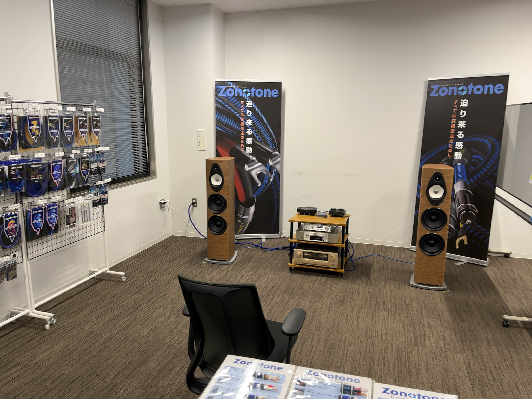 こちらでは自社ブランドZonotone(ゾノトーン)のスピーカーケーブル、RCA・XLRケーブル、LANケーブル等のアクセサリー販売を実施。ご要望があればケーブルの加工も行っておりました。また、試聴ブースにはなんと…Sonus faber(ソナスファベール)の新作スピーカー『SONETTO G2』を特別展示!こちらには新製品のジャンパーケーブル『ZJP-G10』が使用されていました。