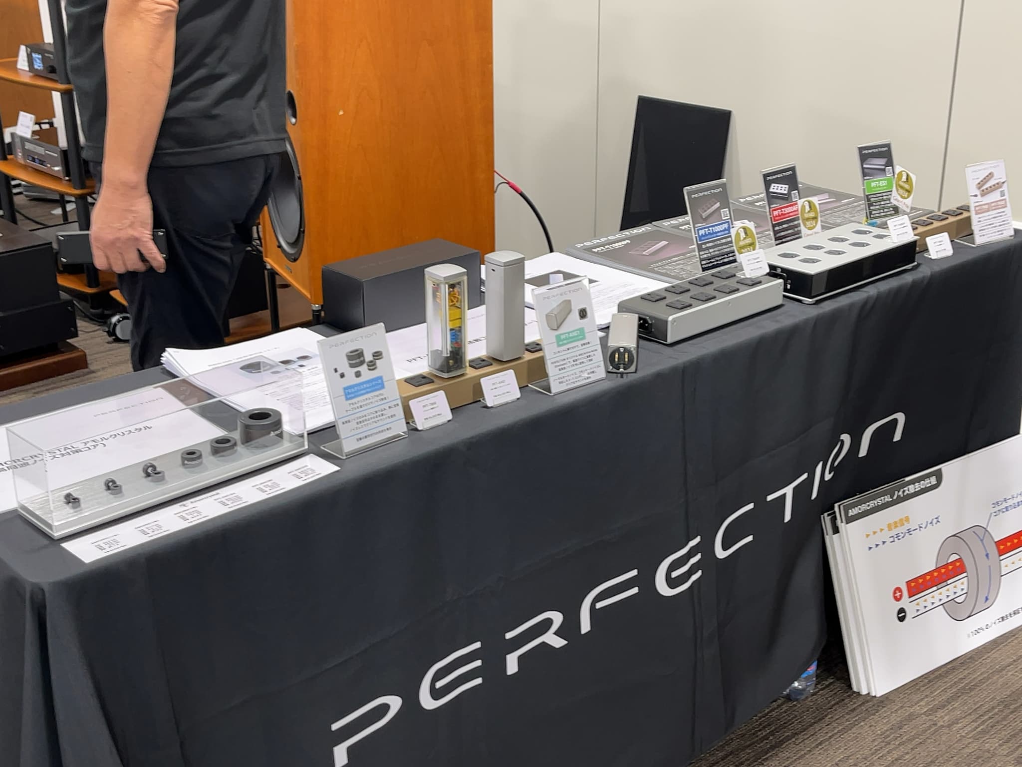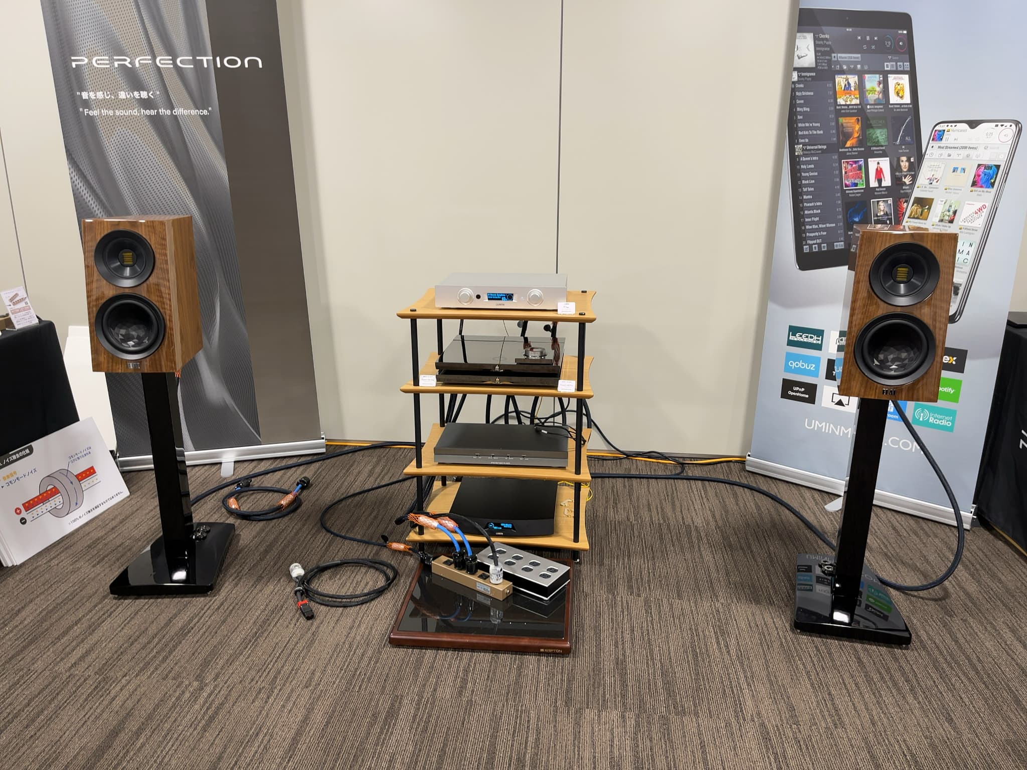 こちらのブースでは、注目商品のLUMIN(ルーミン)のネットワークプレーヤー『X1』、DEVIALET(デビアレ)の薄型プリメインアンプ『Expert 440 Pro』、ELAC(エラック)のブックシェルフ型スピーカー『CONCENTRO S 503.2』を含んだシステムを展示。試聴会ではPERFECTION(パーフェクション)の電源BOX等のオーディオアクセサリーを使用した比較試聴を実施しました。