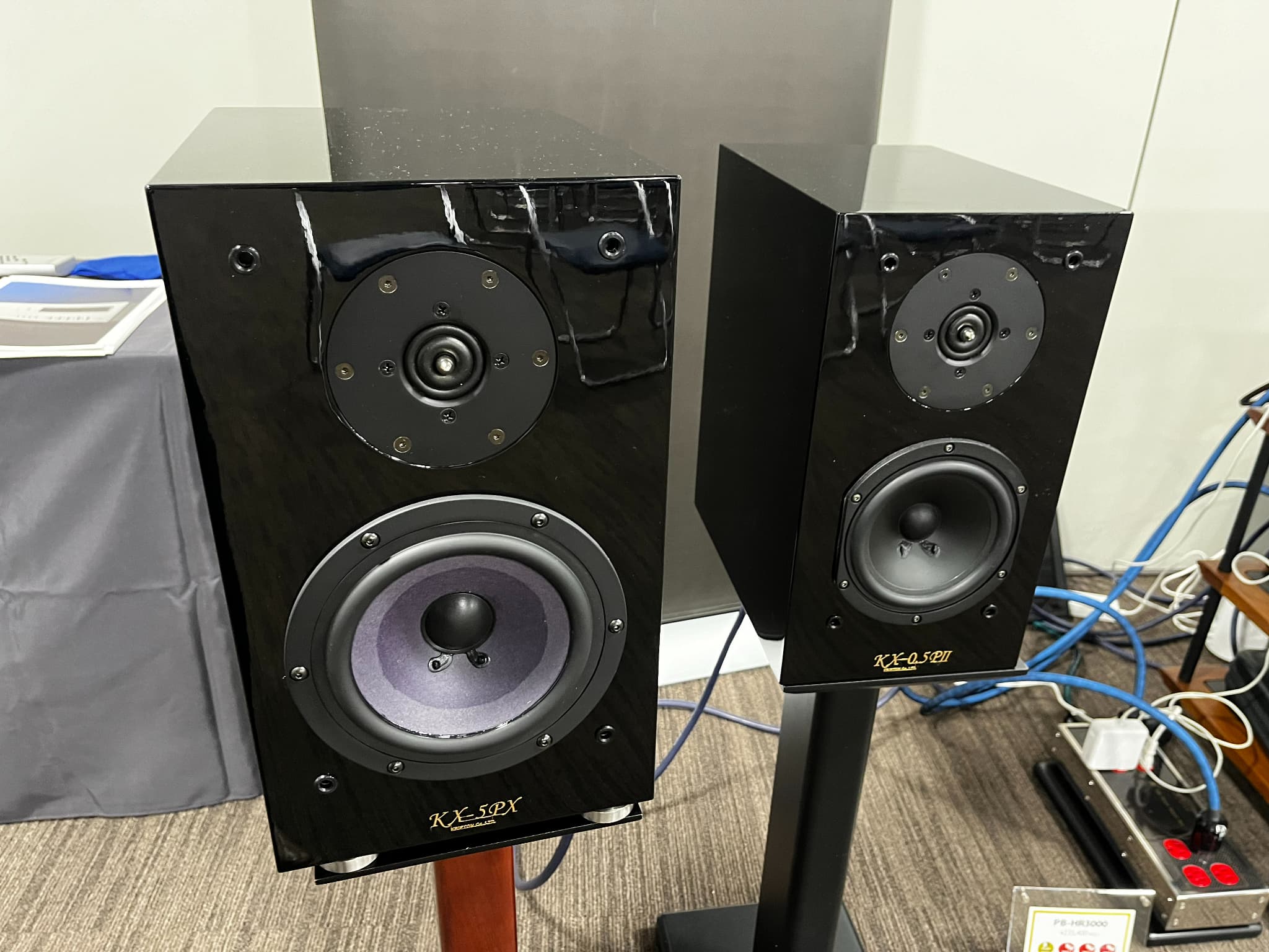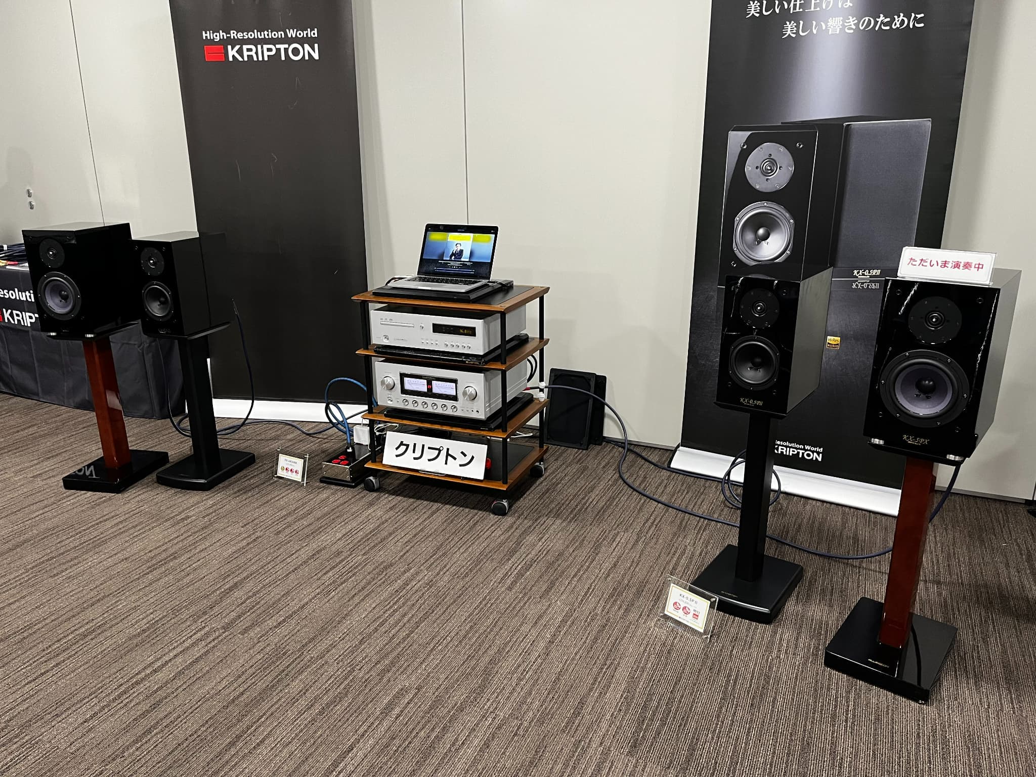 KRIPTON(クリプトン)は『KX-5PX』と、注目商品の『KX-0.5P II』(新製品)のブックシャルフ型スピーカー2機種を展示。試聴ではハイレゾ音源などパソコンに保存されたデータを使用。また、バイワイヤリング接続時の音質比較も実施。その他にも、同社の電源BOXやオーディオボード、スピーカースタンド等が使用されておりました。
