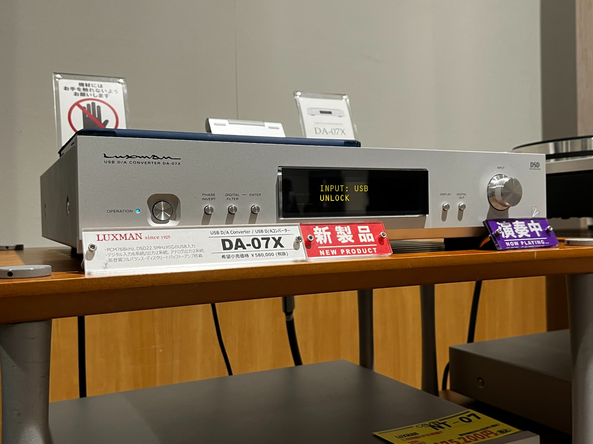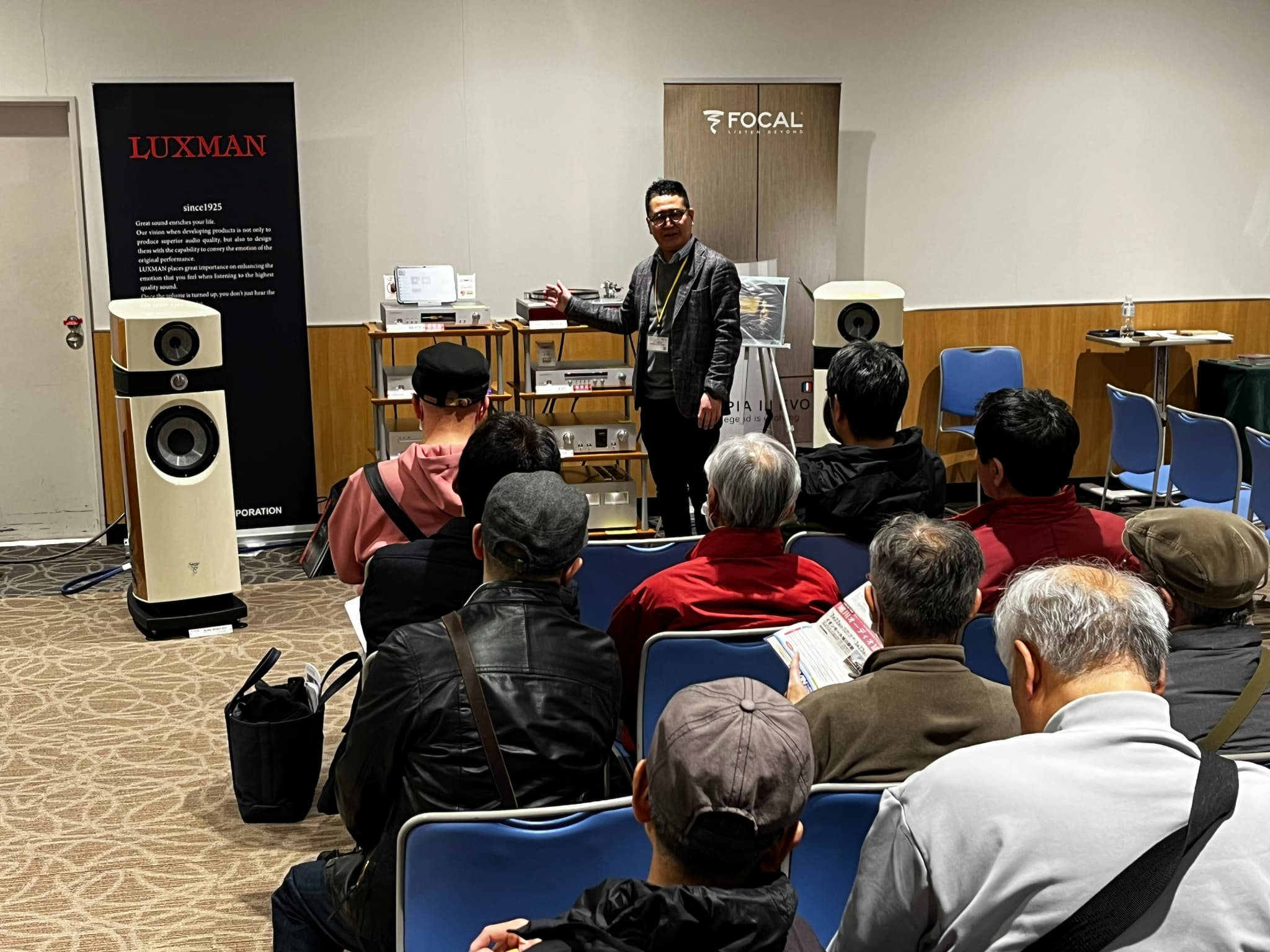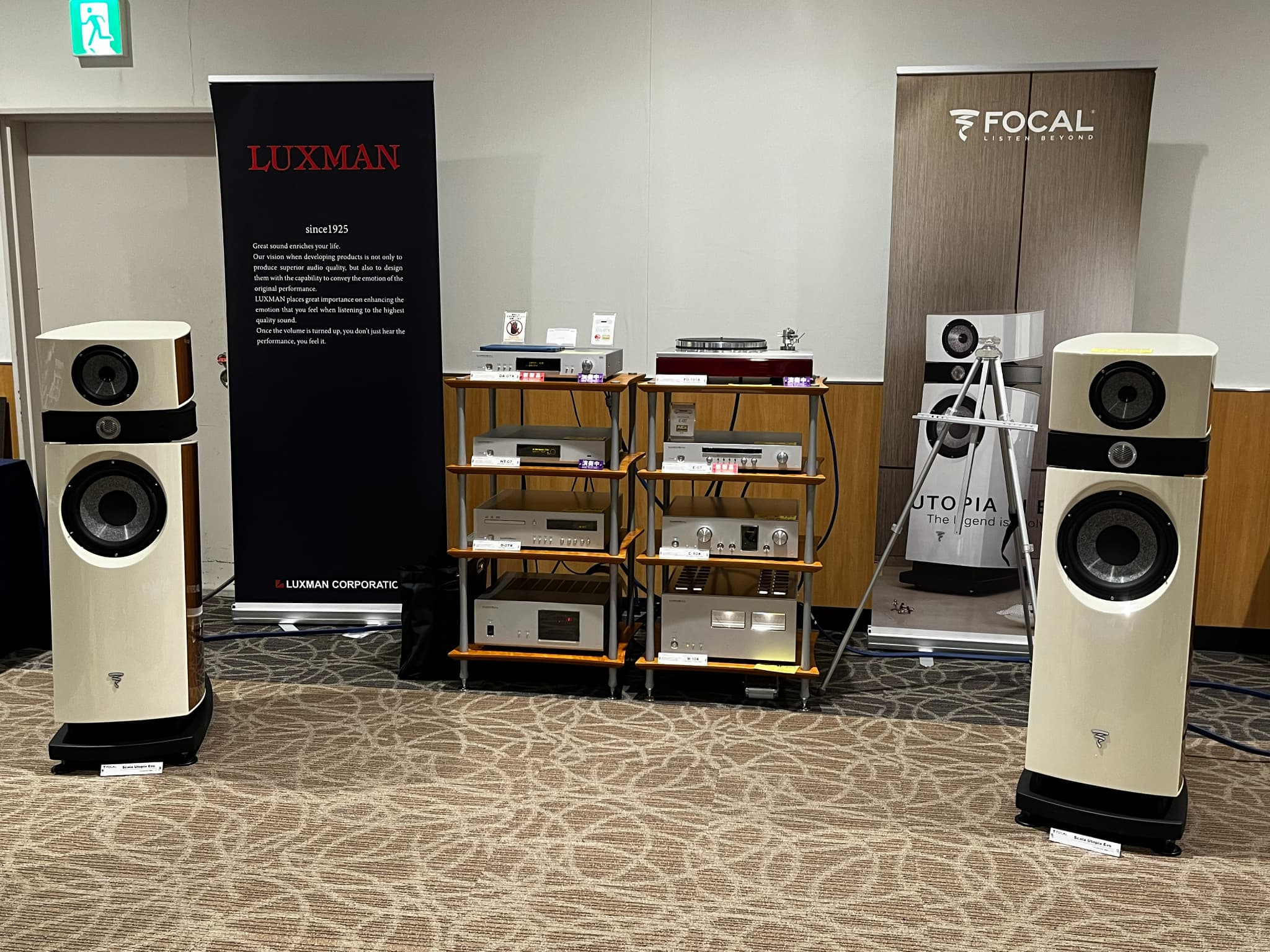 新製品のD/Aコンバーター『DA-07X』と、フォノイコライザーアンプ『E-07』を含めたシステムを展示。スピーカーはフランスFOCALの『Sucala Utopia Evo』を使用。試聴会ではストリーミング再生と、アナログレコード再生が行われ、様々な音源での試聴を楽しむことができました。