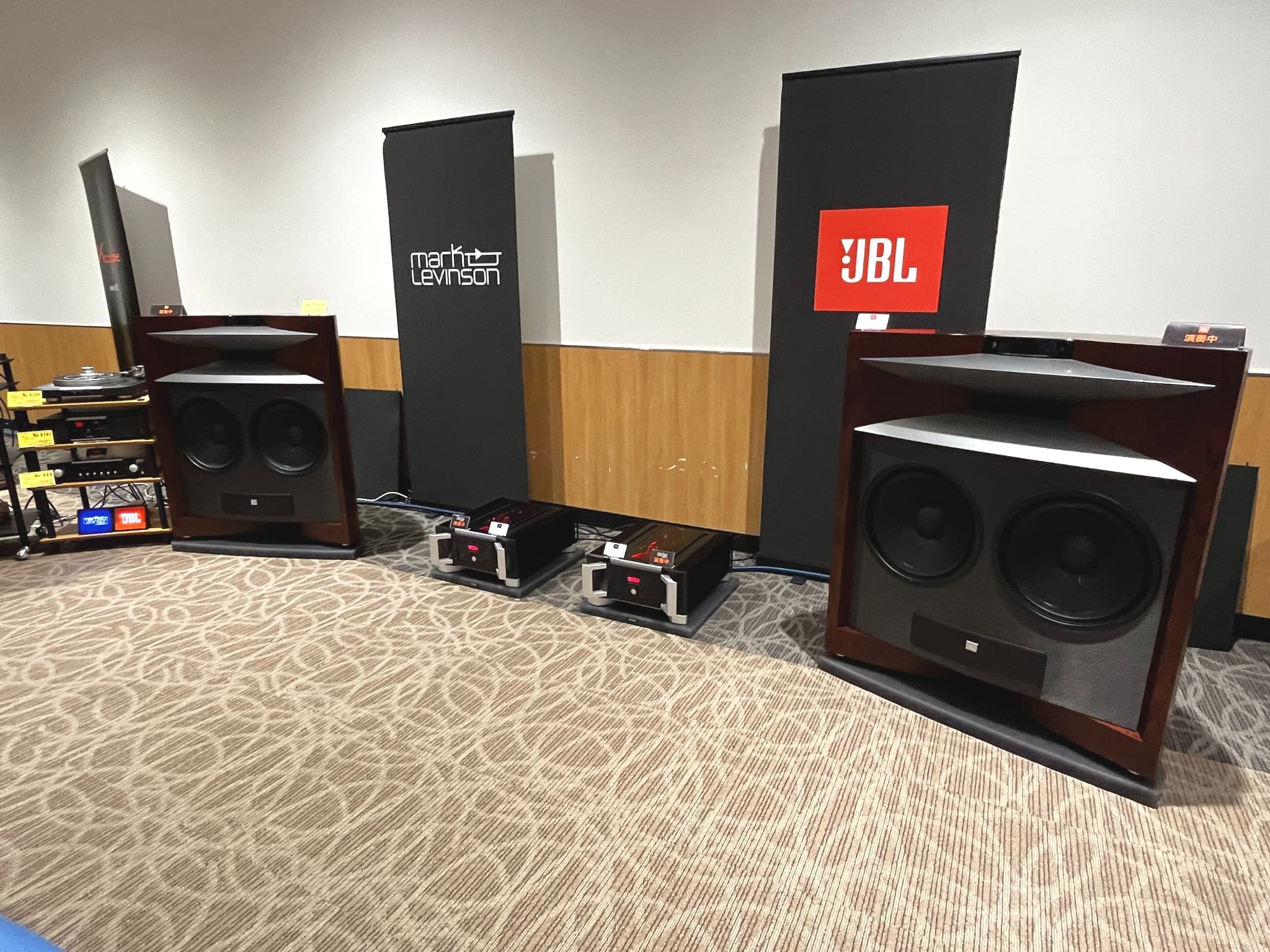 こちらのブースで注目を集めたのは、JBL(ジェービーエル)のフラッグシップ・モデルスピーカー『DD67000』。本機は38cmウーハーが2基搭載され、試聴会ではド迫力のサウンドを披露しました。システムはMark Levinson(マークレビンソン)製品で構成されており、中には世界100ペア限定というモノラルパワーアンプ『ML-50』もありました。実際に聴けた方は非常にラッキーですよ~