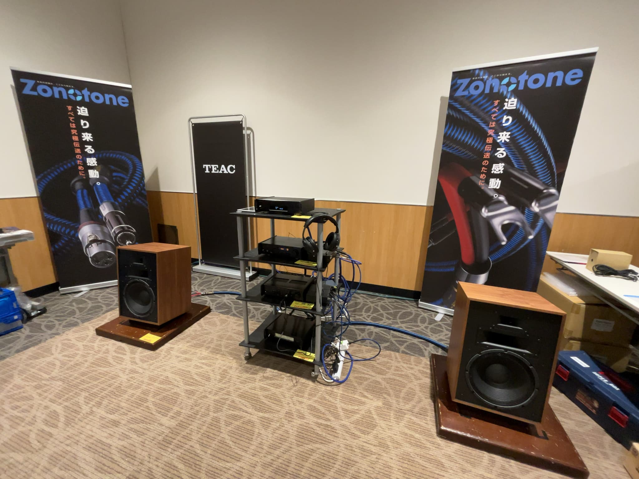 前園サウンドラボが扱うブランド“ZONOTONE(ゾノトーン)”のスピーカーケーブル、電源ケーブル、オーディオケーブル等を販売しておりました。こちらはTEAC(ティアック)と共同ブースとなっており、TEACシステムを使用したZONOTONE製品の試聴も出来ました。また、試聴会では同システムを使ったZONOTONE製スピーカーケーブルの比較試聴が行われました。