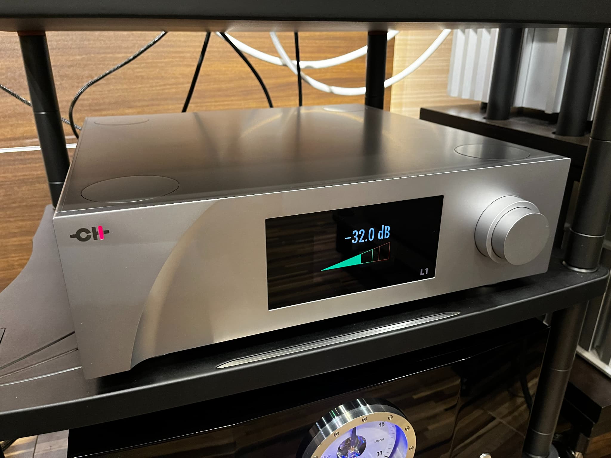- 完全シンメトリック回路構成、完全ディスクリート・超低ノイズ・高スルーレート設計を採用。また、振動を最小限に抑えるためにサイレントブロックにマウントされた大容量1700VAの電源トランスを搭載。『L1』と同じく、大きな表示パネルを実装。