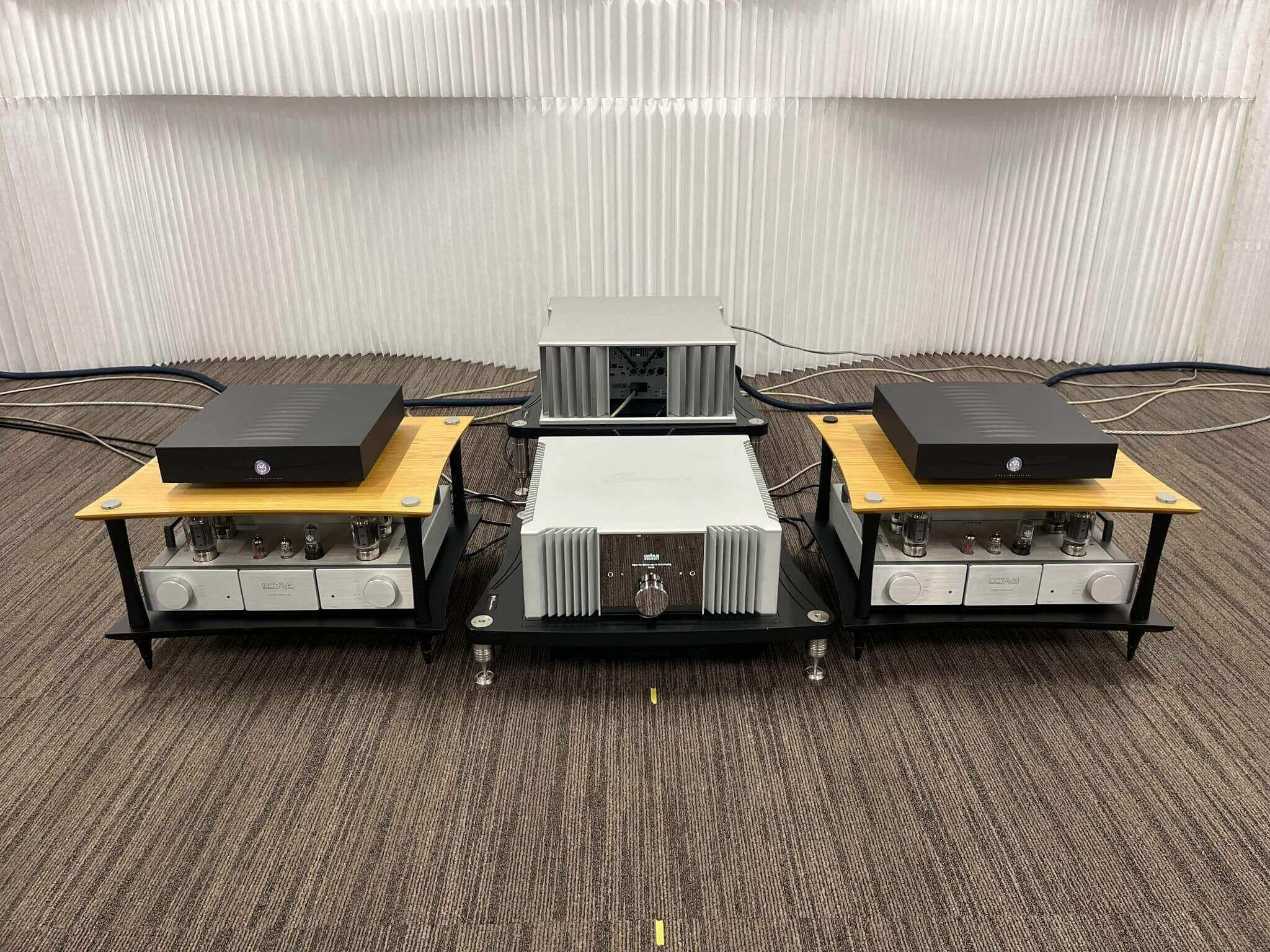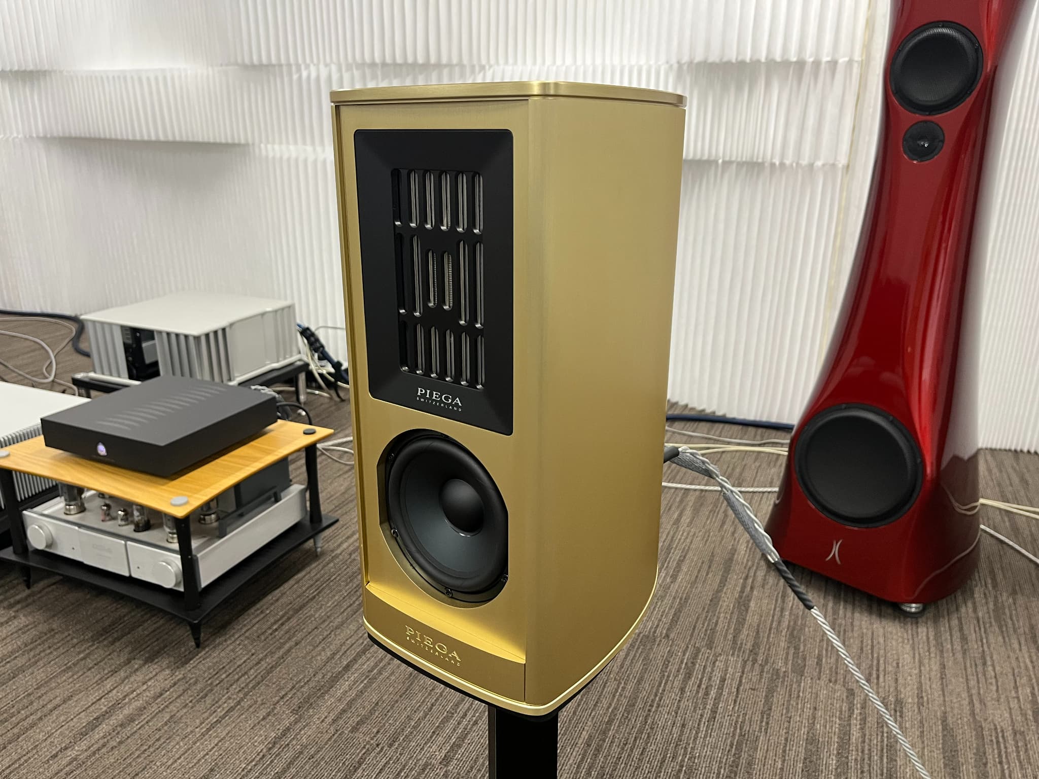 こちらは Piega(ピエガ)の新スピーカー『Coax 411 Gen2』と、Ocatve(オクターブ)の真空管モノラルパワーアンプ『MRE220 SE(KT120)』、プリアンプ『HP300SE』を展示。Coax 411 Gen2は、Coax Gen2シリーズのために特別に作られたカラーバリエーション“Coax Excellence Series” のゴールド仕様で、非常に美しい仕上がりとなっておりました。