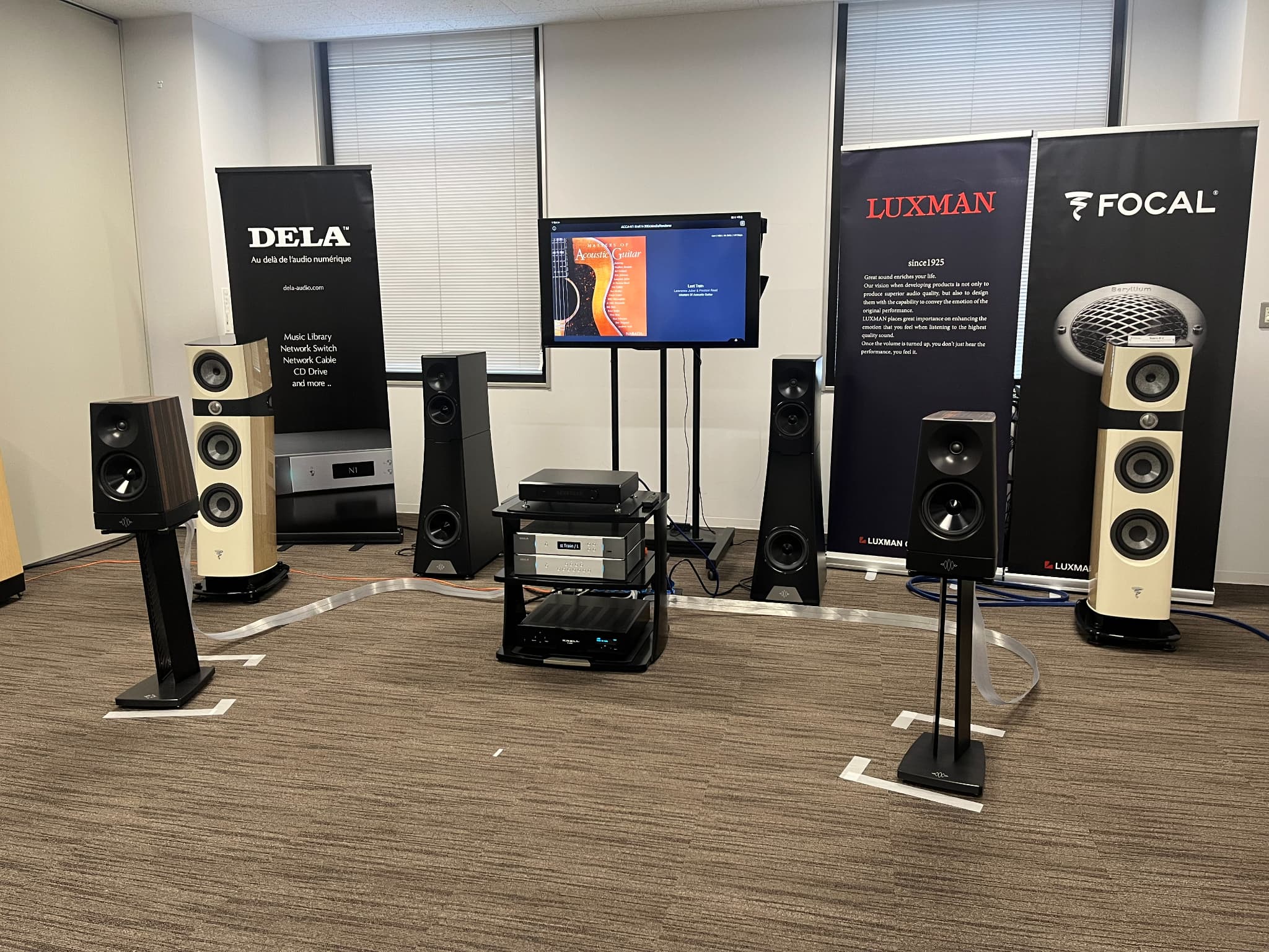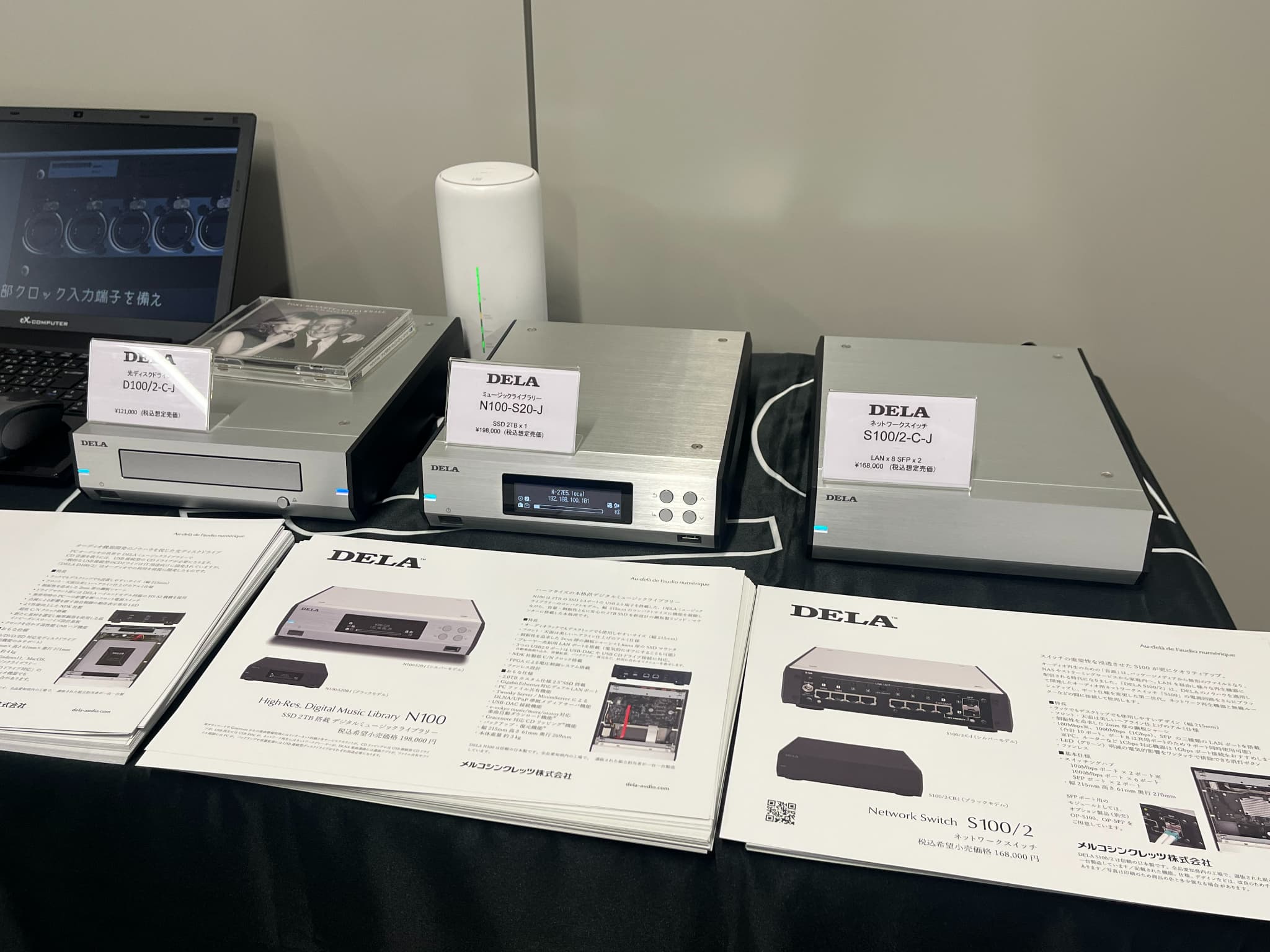 DELA(デラ)のブースではネットワークオーディオに特化したオーディオ機器を多数展示。試聴会では、ミュージックライブラリー『N1-S38-J』と、ネットワークスイッチ『S1-X-J』を使用したネットワークオーディオの試聴が出来ました。プレーヤーやアンプだけではなく、周辺機器も音質に影響することがよく分かります。その他、コンパクトなエントリーモデル『100シリーズ』も展示されておりました。