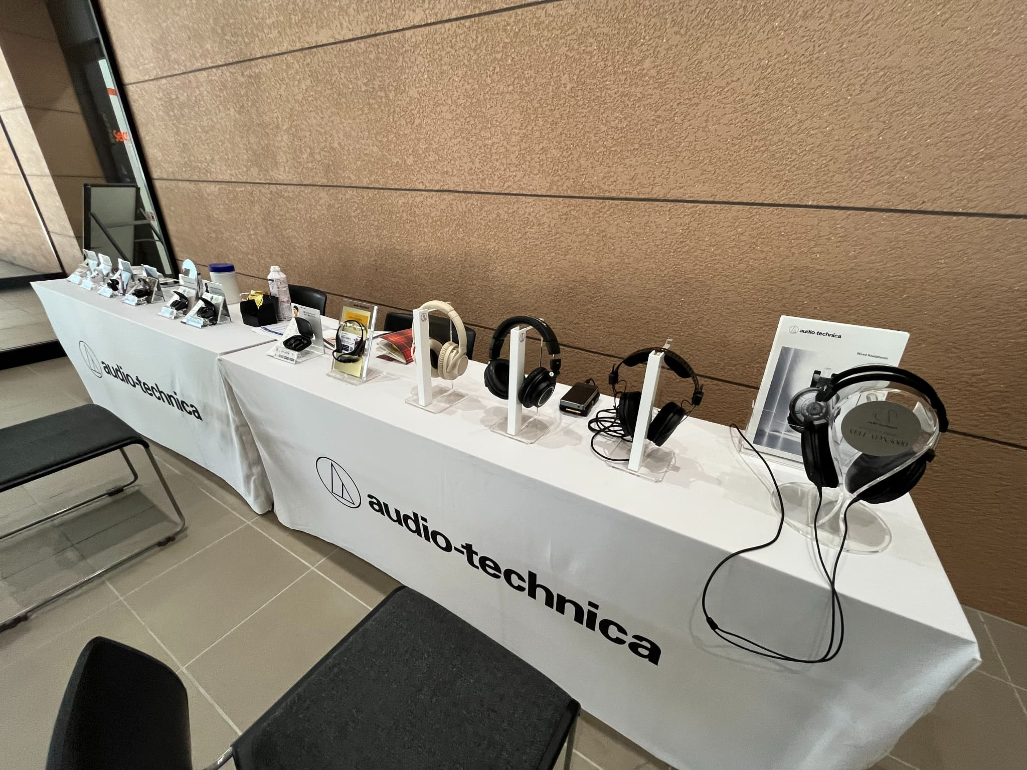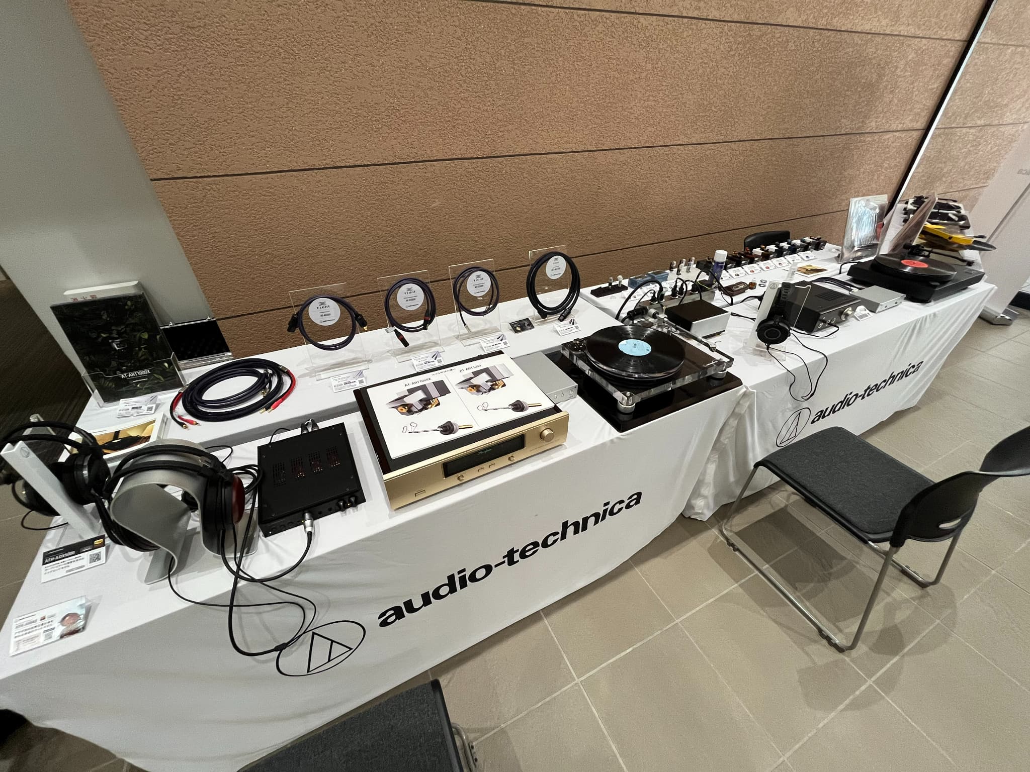 audio-technica(オーディオテクニカ)はブースを2つに分けて商品を展示。注目商品は同社初となるダイレクトパワー方式のMCカートリッジ『AT-ART1000X』。お洒落なスケルトンのアナログプレーヤー『AT-LPA2』を使用して試聴をされているお客様がたくさんいらっしゃいました。他にもHi-FiケーブルシリーズのFLUAT(フリュエット)や、エアーダイナミックヘッドホンのフラッグシップモデル『ATH-ADX5000』等もございました。
