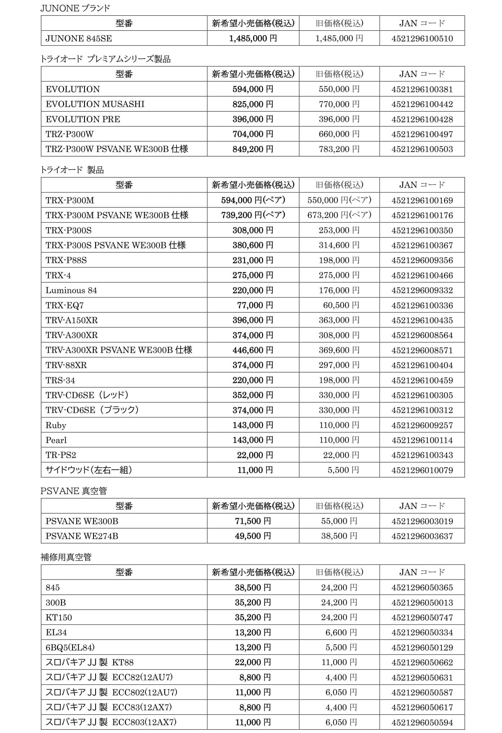 Triode・TEAC ・ortofon 価格改定のお知らせ