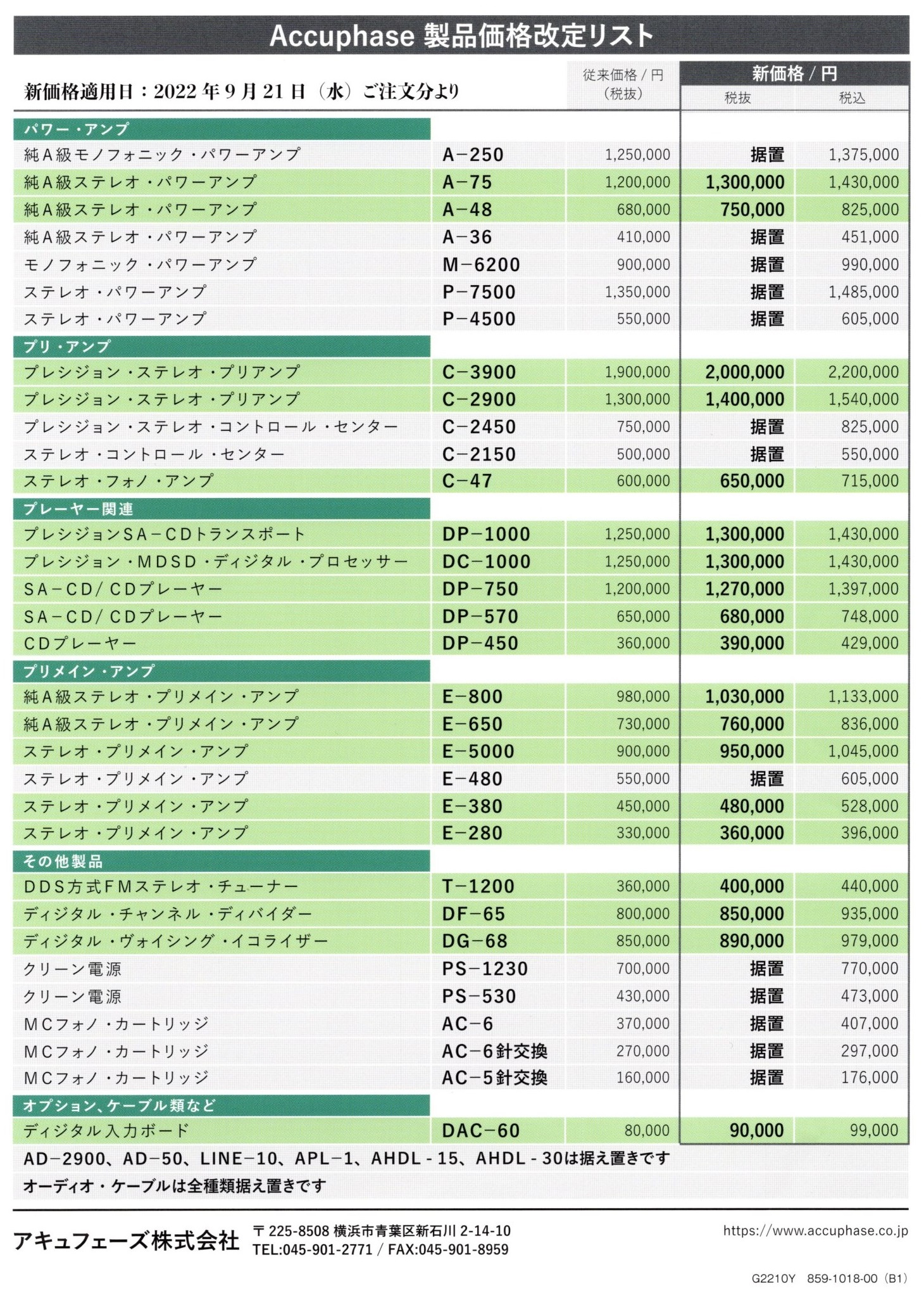 アキュフェーズ 一部製品の価格改定のお知らせ