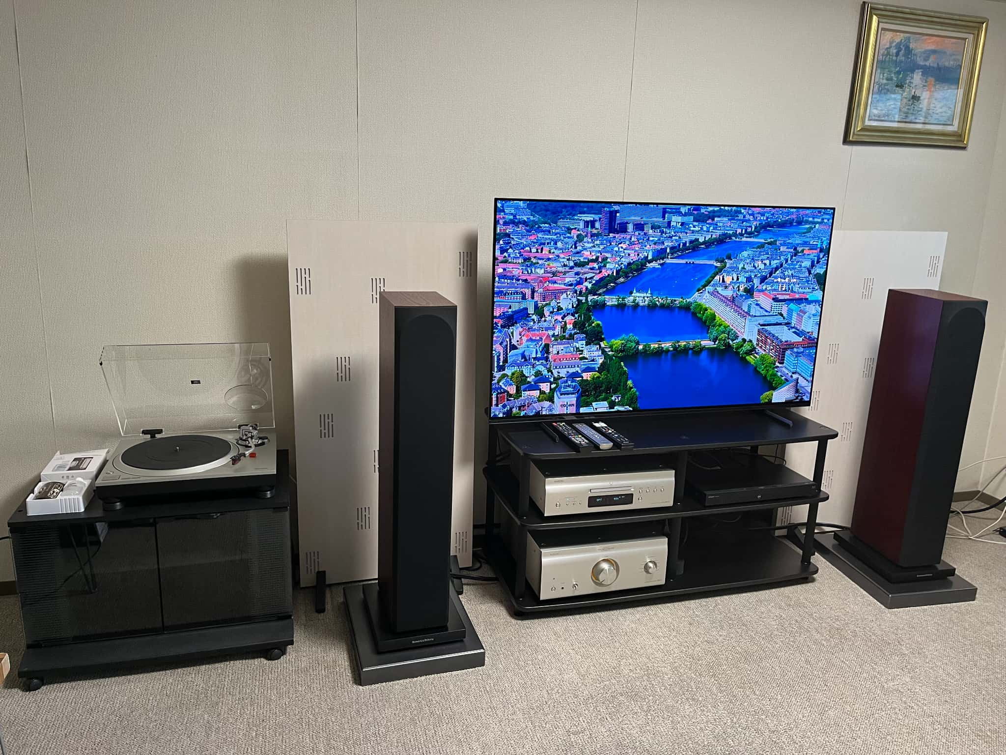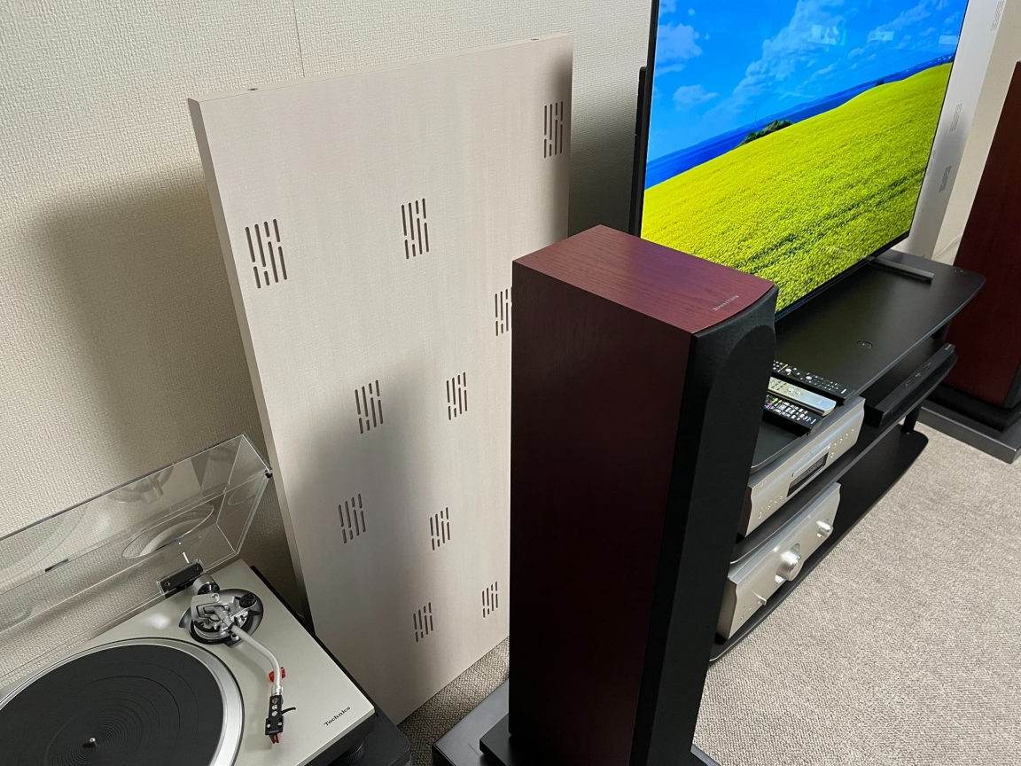 メインスピーカーはバイワイヤー接続で、さらに下にはオーディオボードを敷き、背面には音響調音パネルを設置しており、より音質を向上させています。