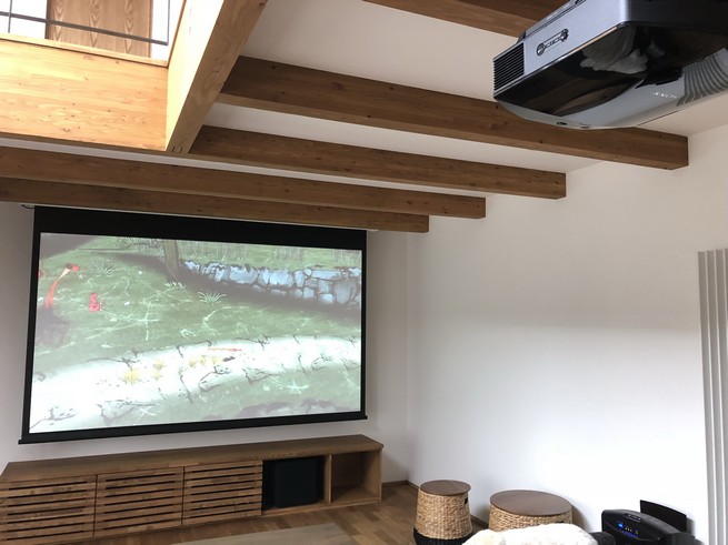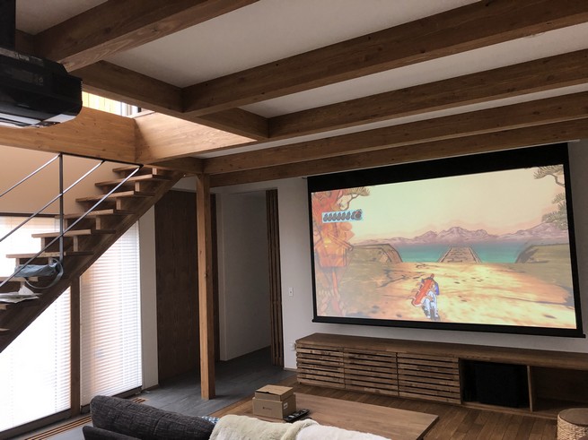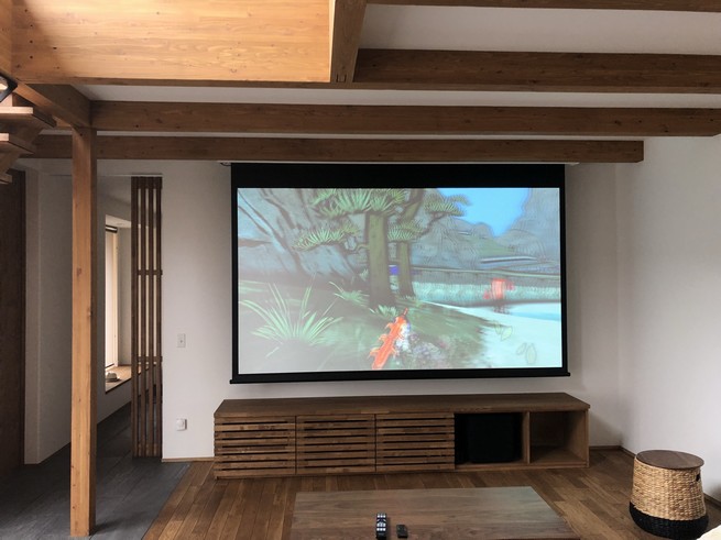 スクリーンはキクチのグランビュー電動スクリーン120インチ、プロジェクターはソニーのVPL-HW60になります。