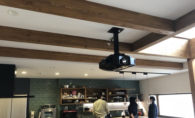 120インチの迫力ある映像は、キッチンからでも字幕もしっかりと見え、奥様にも喜んで頂けました。