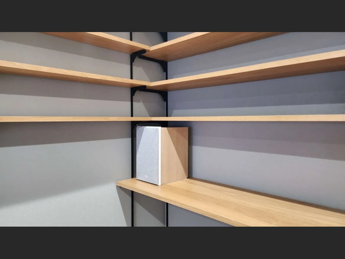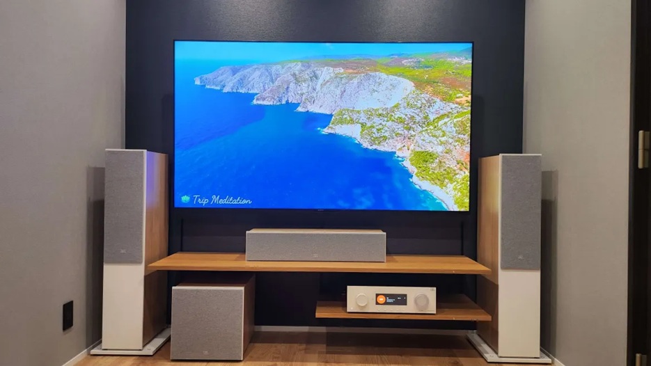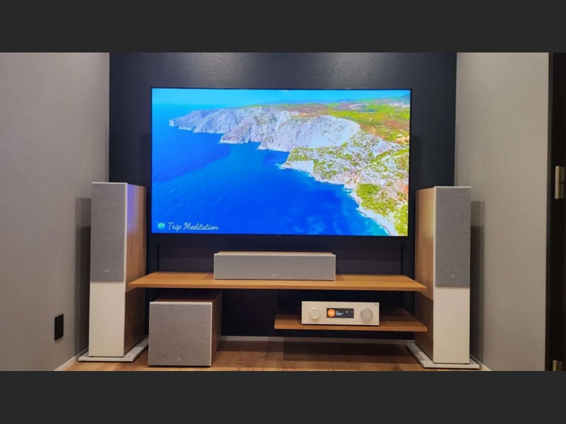 今回プロジェクターを使わずにSONY75型テレビ「KJ-75X80L」とJBL新スピーカーSTAGE2シリーズ、JBL初のAVアンプ「MA9100HP」を使用し5.1.2chシステム(前3本、後ろ2本、天井2本、サブウーファー1台 計8本)を導入いたしました。