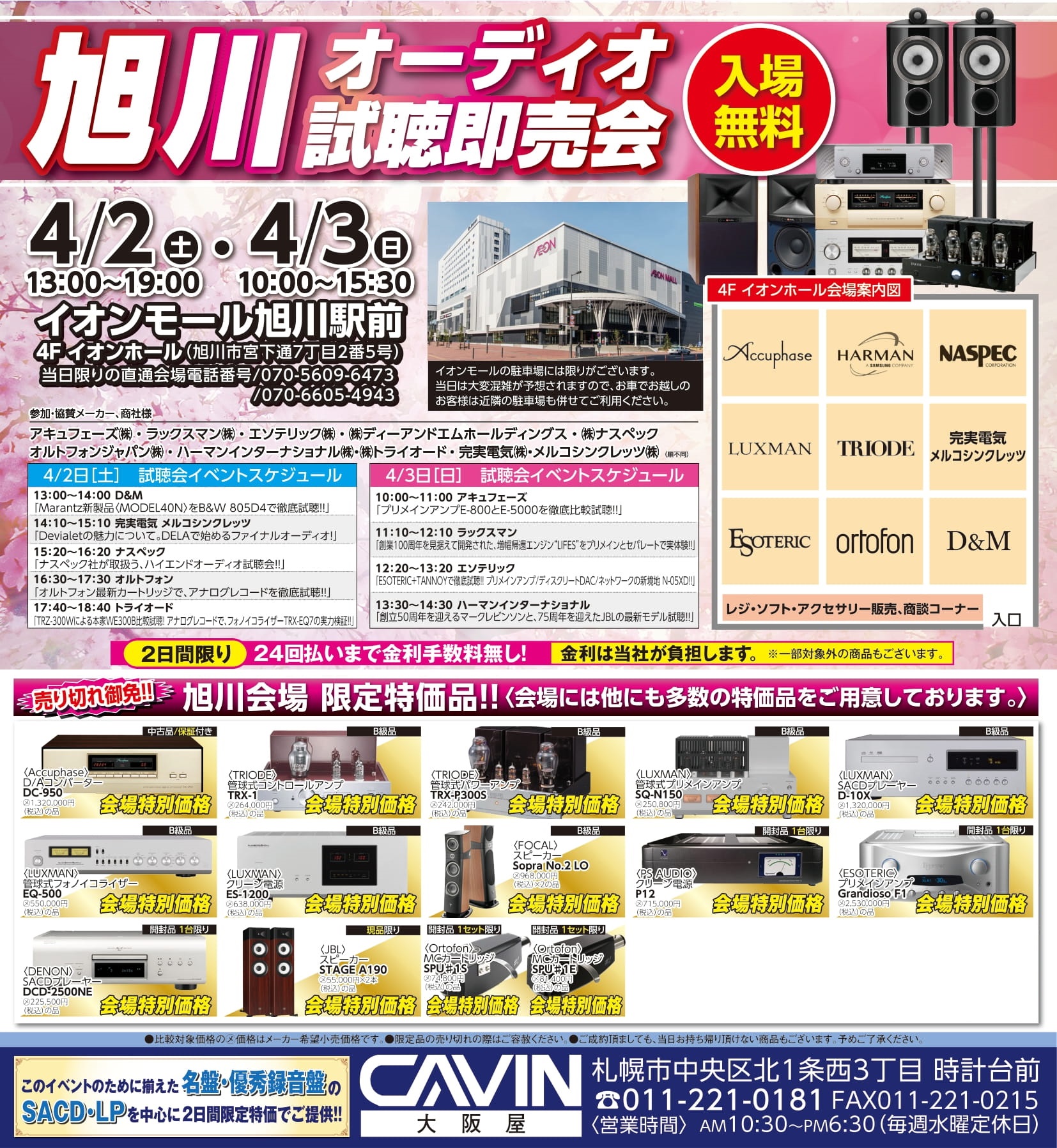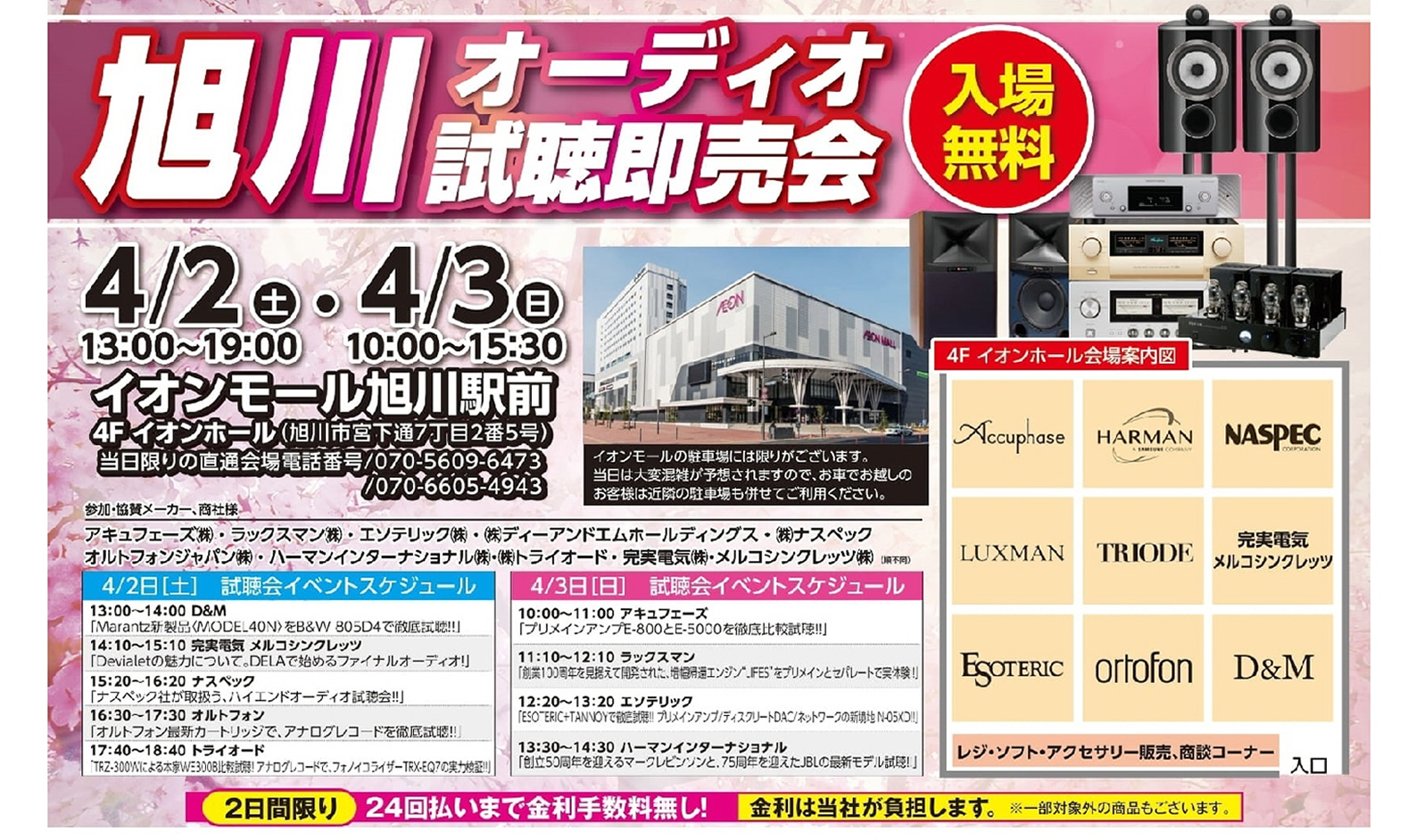 4月2日(土)、3日(日)の2日間、旭川市のイオンモール旭川駅前店にて「旭川オーディオ試聴即売会」を開催いたします!!