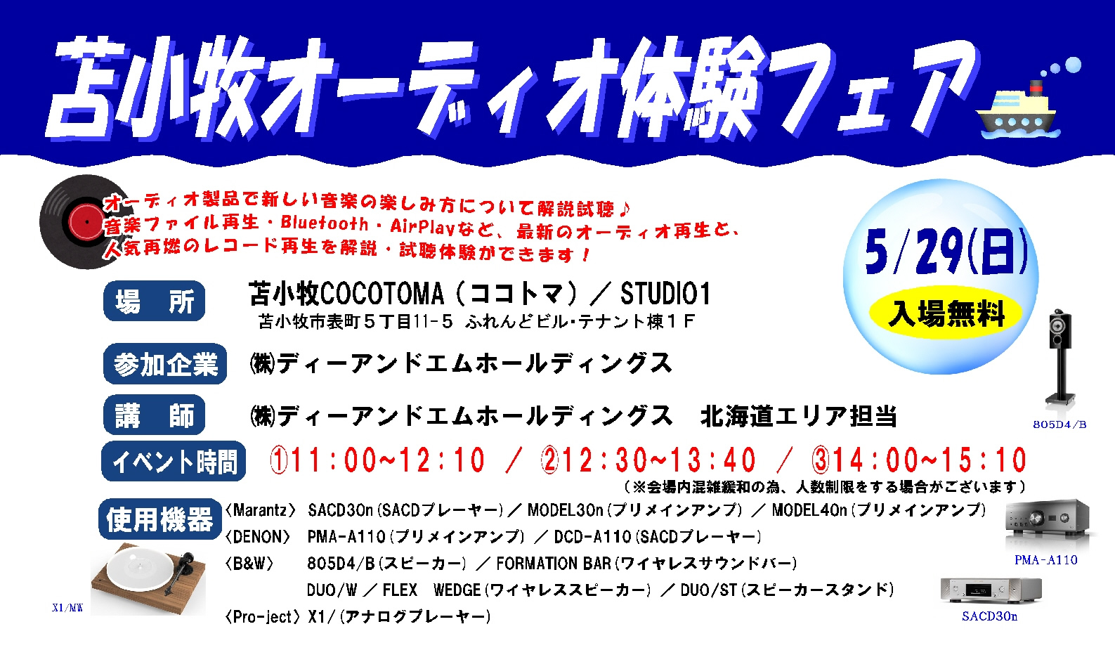 5月29日(日)、苫小牧駅横のふれんどビル・テナント棟1Fにある苫小牧COCOTOMA(ココトマ)のSTUDIO1にて「苫小牧オーディオ体験フェア」を開催!参加無料です!!