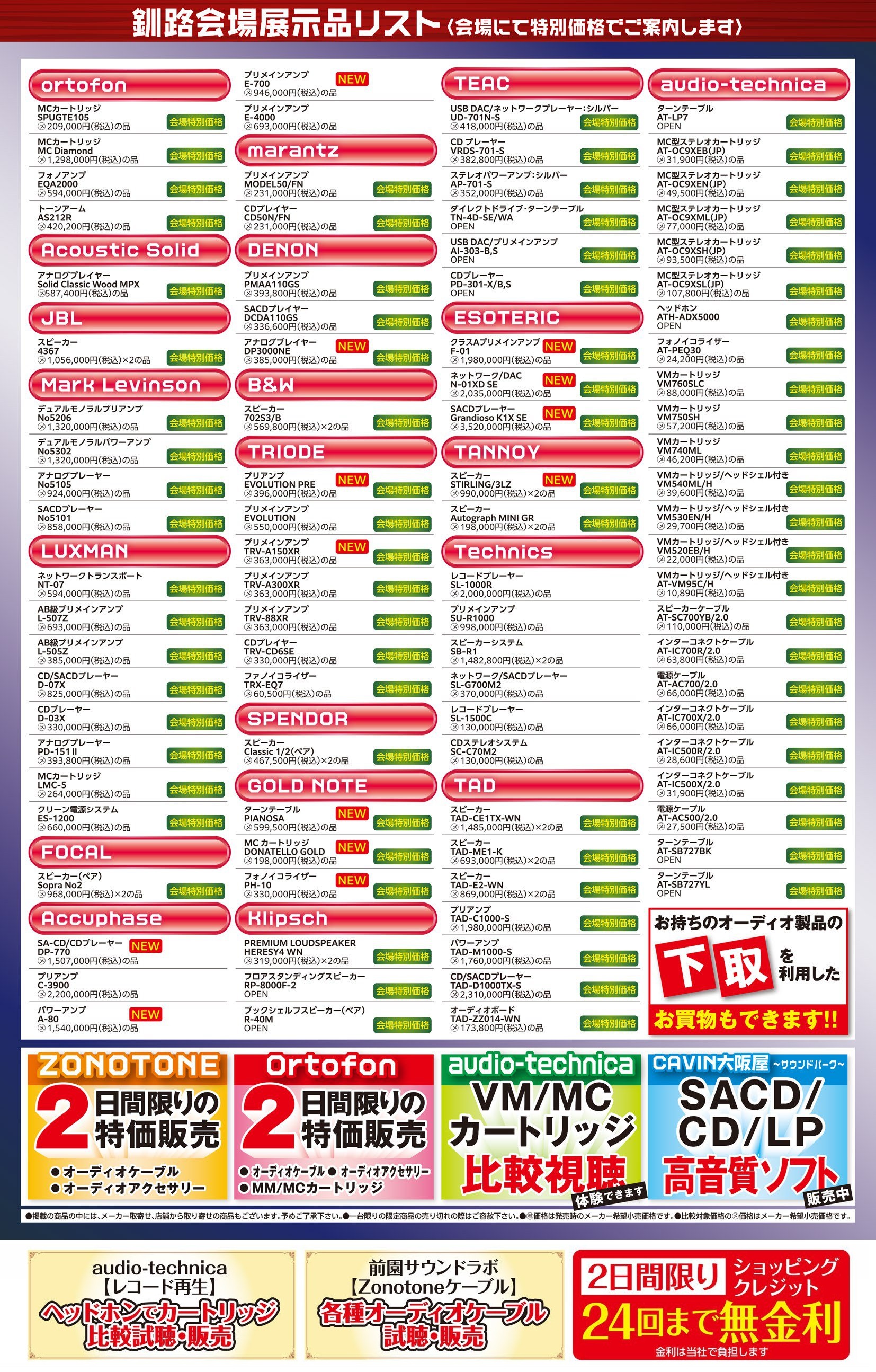 今回は11社オーディオメーカー・商社が参加し、普段なかなか聴く事が出来ないアンプ・CDプレーヤー・スピーカー・アクセサリー等のオーディオ製品を会場特価にてご提供!!