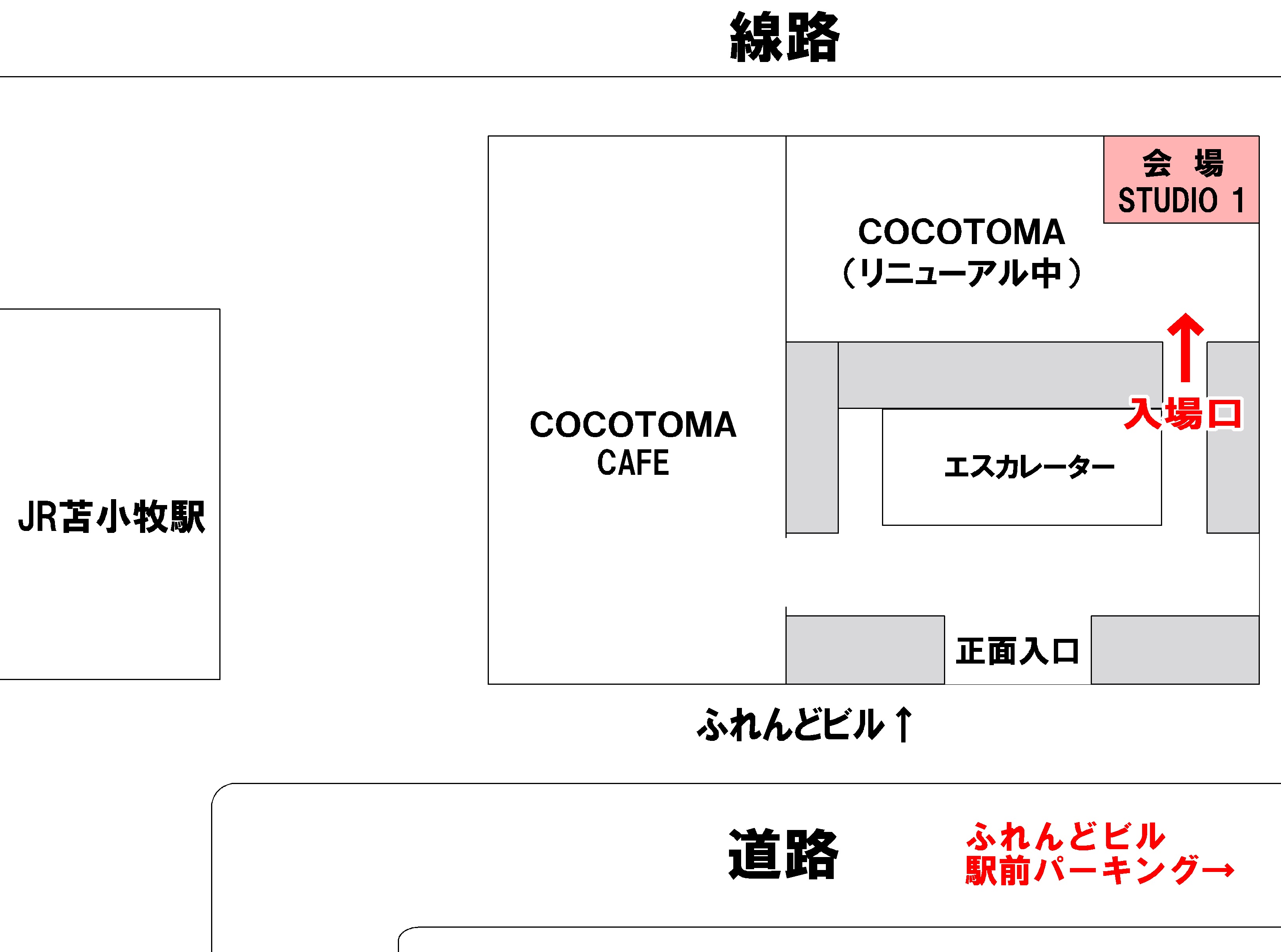 | 会場 | 苫小牧COCOTOMA(ココトマ) / STUDIO1(北海道苫小牧市表町5丁目11-5 ふれんどビル・テナント棟1F)JR苫小牧駅より徒歩1分 《出入口変更のお知らせ》