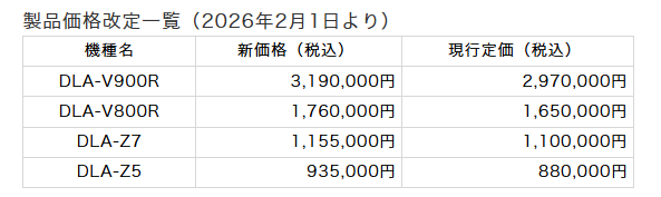 2026年2月1日より一部プロジェクター製品の価格改定されます。
