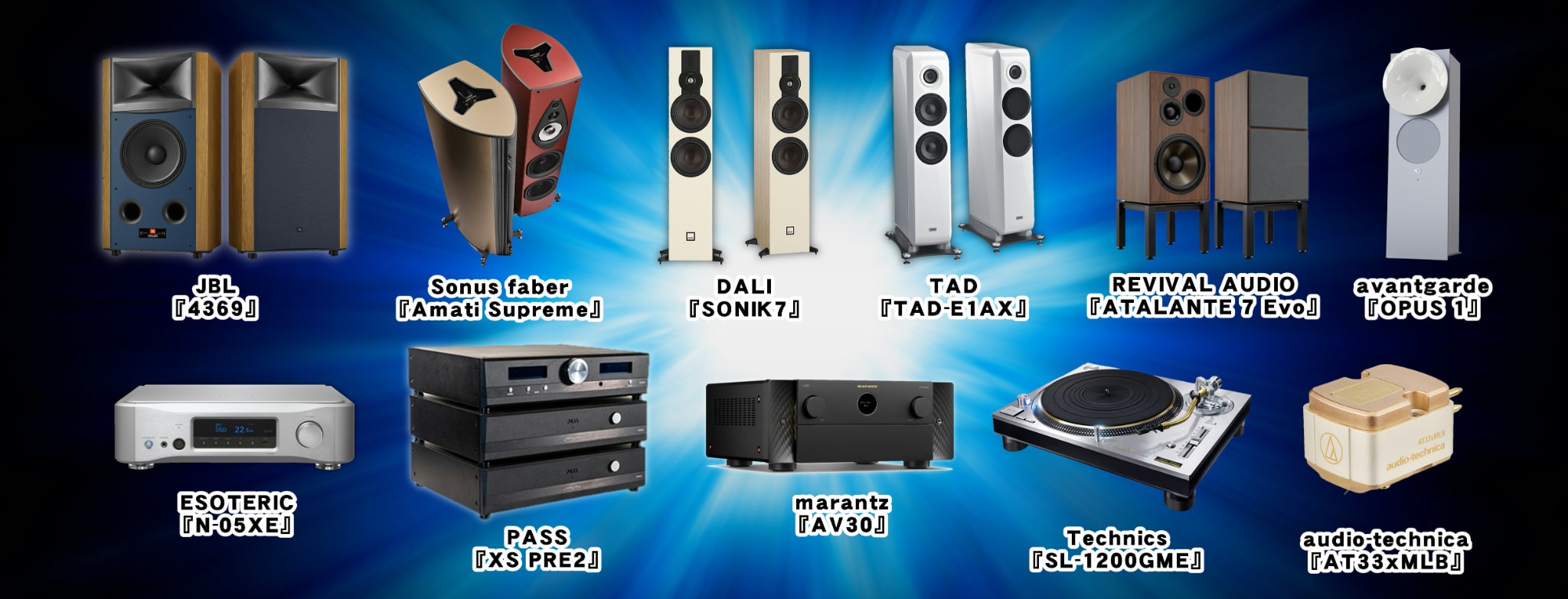 JBL(ジェイビーエル)『4369』、Sonus faber(ソナスファベール)『Amati Supreme』、DALI(ダリ)『SONIK7』、TAD(タッド)『TAD-E1AX』と、REVIVAL AUDIO(リバイバルオーディオ)『ATALANTE 7 Evo』、avantgarde(アヴァンギャルド)『OPUS 1』といった注目の新スピーカーや、ESOTERIC(エソテリック)ネットワークDAC/プリ『N-05XE』、PASS(パス)のプリアンプ『XS PRE2』、marantz(マランツ)のAVアンプ『AV30』、Technics(テクニクス)のアナログプレーヤー『SL-1200GME』、audio-technica(オーディオテクニカ)のMC型カートリッジ『AT33xMLB』などなど、最新モデルや注目商品が試聴可能!!
