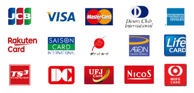 JCB / VISA / マスターカード / ダイナースクラブ / アメリカン・エキスプレス / 楽天カード / セゾンカード / ポケットカード / イオンカード / ライフカード / ティーエスキュービック / DCカード / UFJカード / ニコスカード / MUFGカード