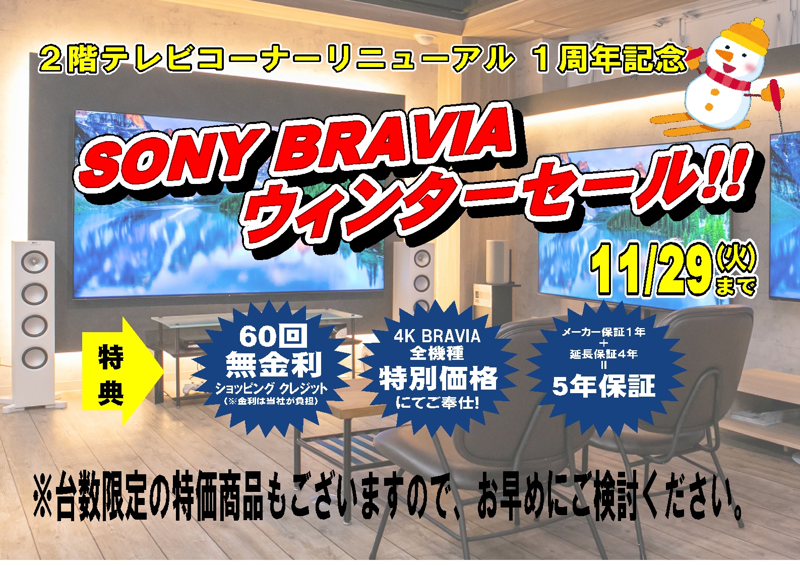 昨年の10月にリニューアルいたしました、2Fテレビコーナーも1年経ち、これを記念してSONY BRAVIA ウィンターセールを開催する事となりました。