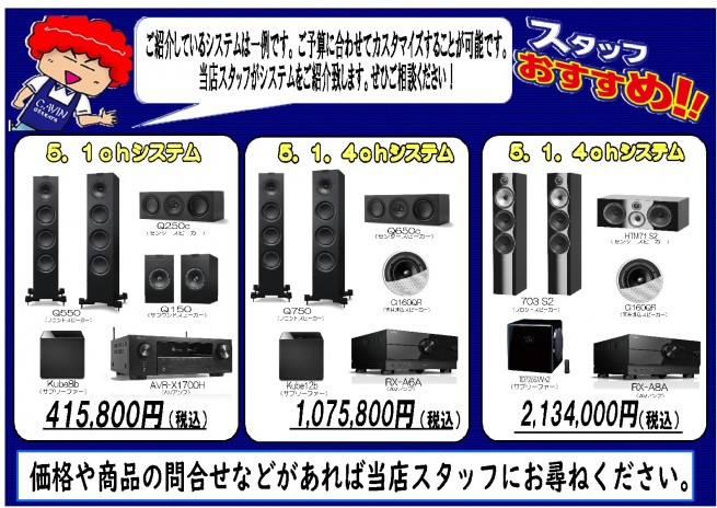そこで、価格や組み合わせでお悩みの方に、当店スタッフがおススメする5.1ch~5.1.4chシステムをご紹介いたします。