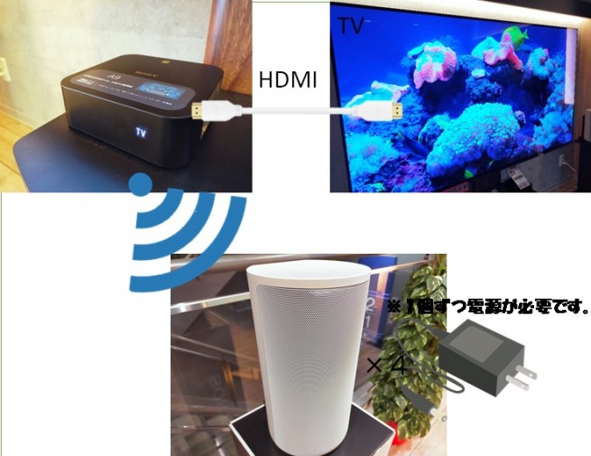 TVとHDMIで接続したコントロールボックスと4つのスピーカーはワイヤレスで接続します。4つのスピーカーは必ずしも視聴者を中心に正方形に設置する必要がなく、高さを合わせる必要もありません。