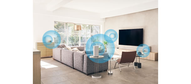 4体のリアルスピーカーからの音の波面を合成し、最大12個のファントムスピーカーを生成します。また、音場最適化技術により、スピーカー間や天井までの距離を内蔵マイクで自動計測し、スピーカーの置かれている空間を把握。その情報を元に広大な音場空間を創り出し、リビングが音で満たされるような360立体音響を体験できます。