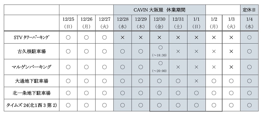 当店指定駐車場の年末年始の営業状況をお知らせ致します。当店営業日で、一部ご利用頂けない駐車場がございますので、ご了承願います。