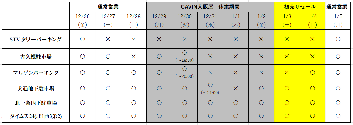 当店指定駐車場の年末年始の営業状況をお知らせ致します。当店営業日で一部ご利用頂けない駐車場がございますので、ご了承願います。(※古久根駐車場は日曜・祝日が定休日となっております)