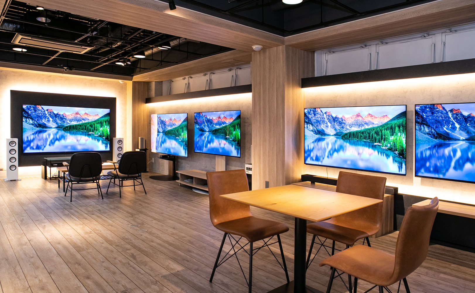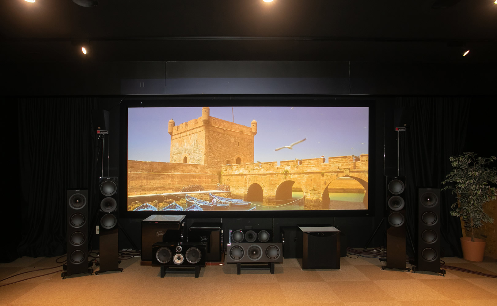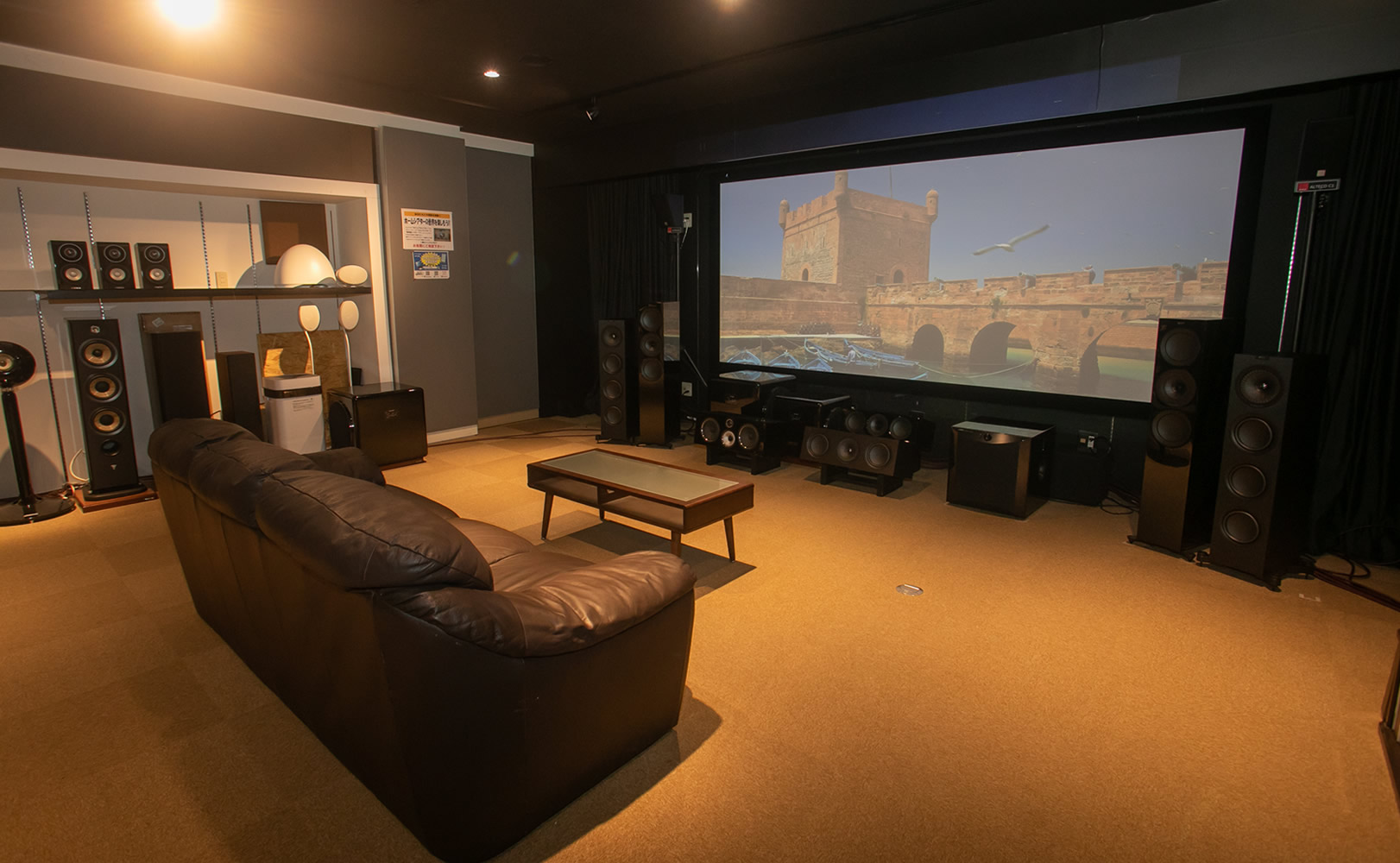 プロジェクターやAVアンプ/国内外のスピーカーで、マルチチャンネルシステムの臨場感を体験いただけます。迫力の150型(シネスコ)スクリーンを常設!!ソニー4Kテレビフルライン展示しています。